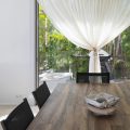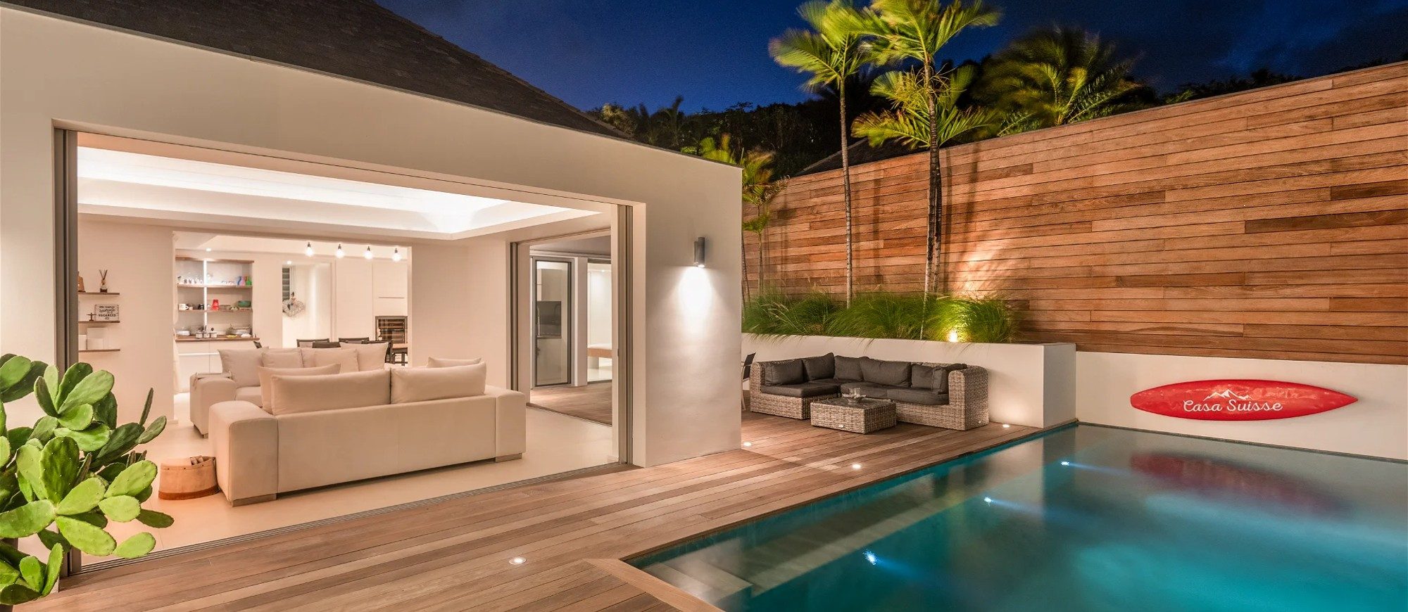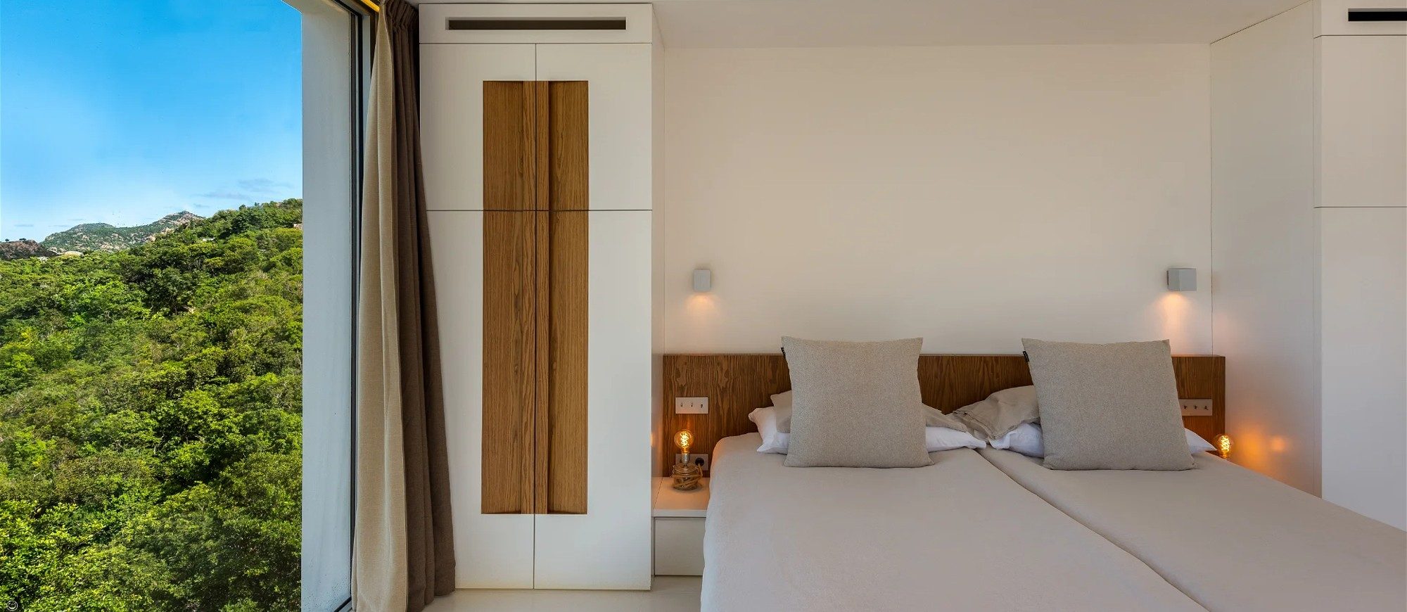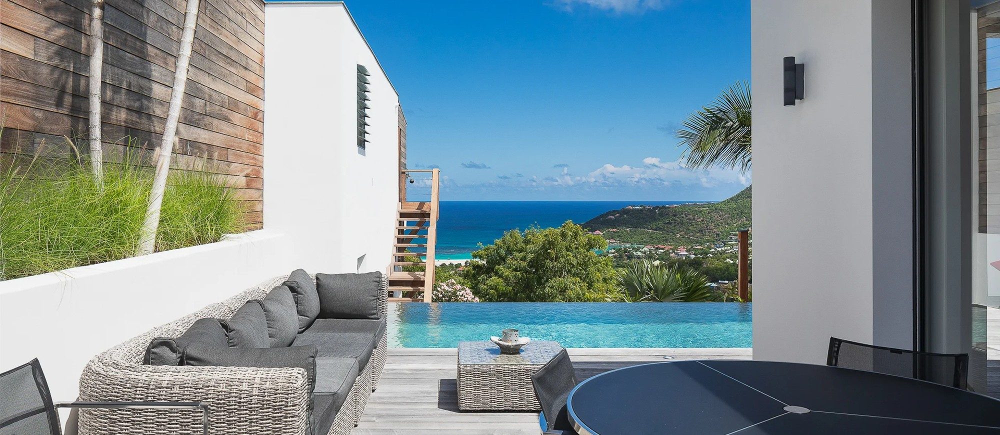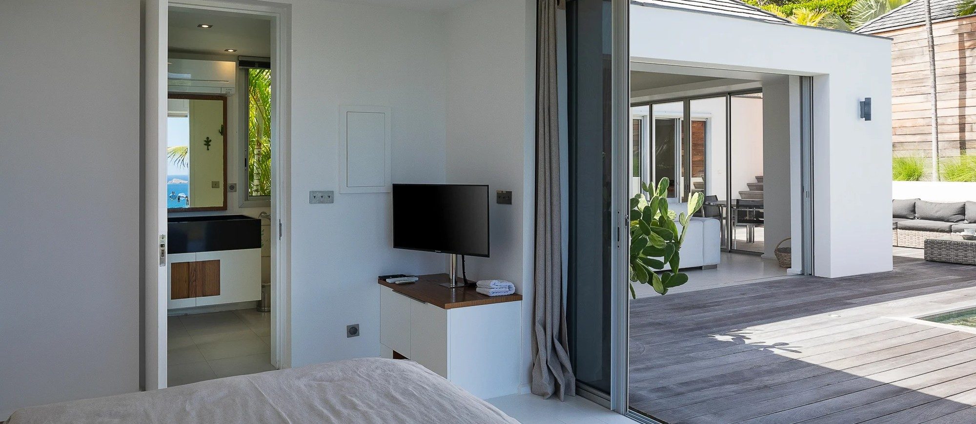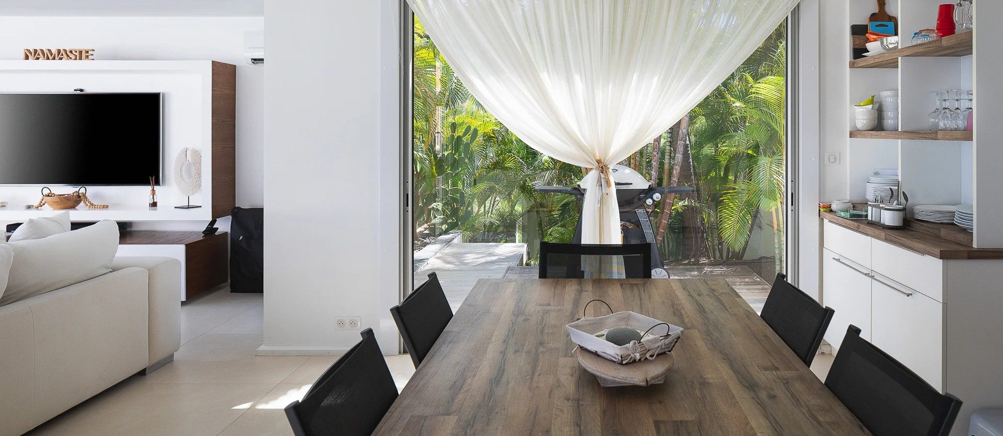 The property is located in Lurin in the private neighbourhood of Pogamus, on a hillside, with magnificent views over the bay of Saint Jean. The living and bedroom both open onto the terrace and swimming pool. At the back of the house, the dining room can accommodate up to six guests close to the well-equipped kitchen. Fully air-conditioned, this indoor space is elegant and relaxing.