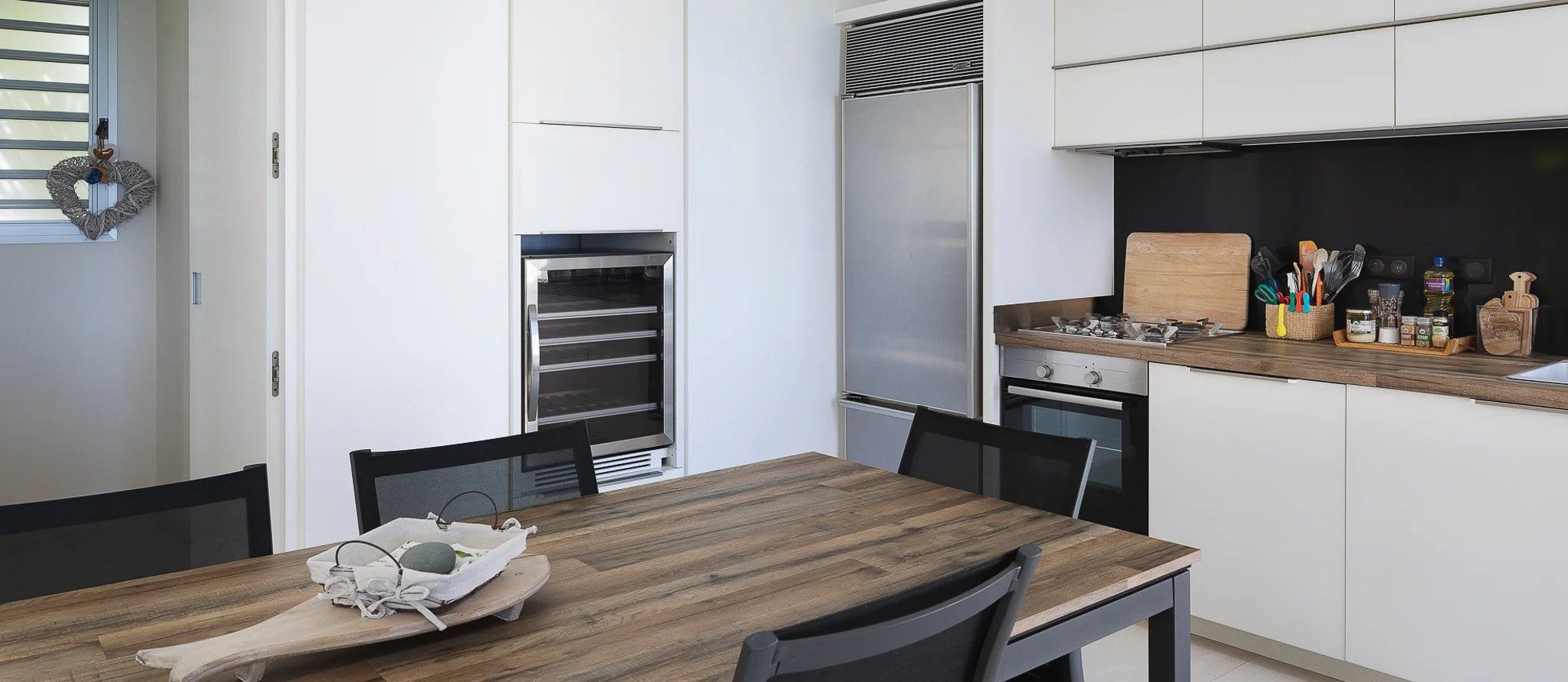 Fully equipped and air-conditioned kitchen. Electric oven, gas stove, microwave, refrigerator, mixer, centrifuge, freezer, dishwasher, Nespresso machine, blender, kettle, toaster. Dining table for 6 guests in the living room. Outdoor dining area on the terrace next to the pool.