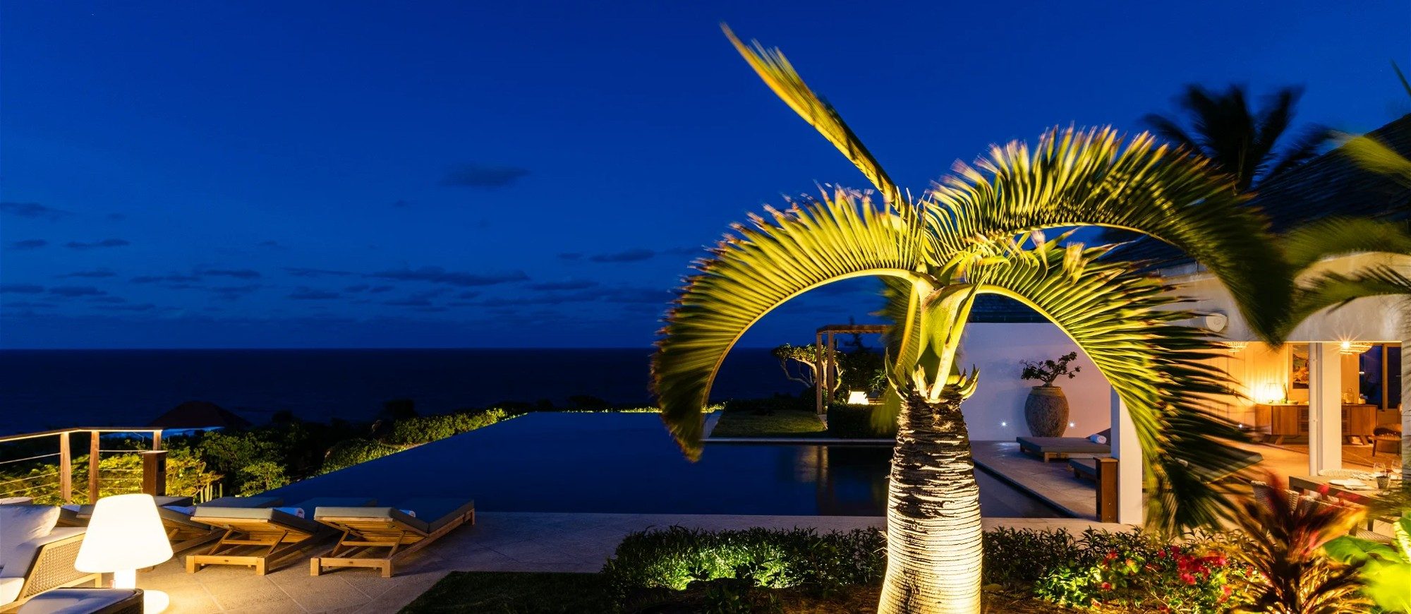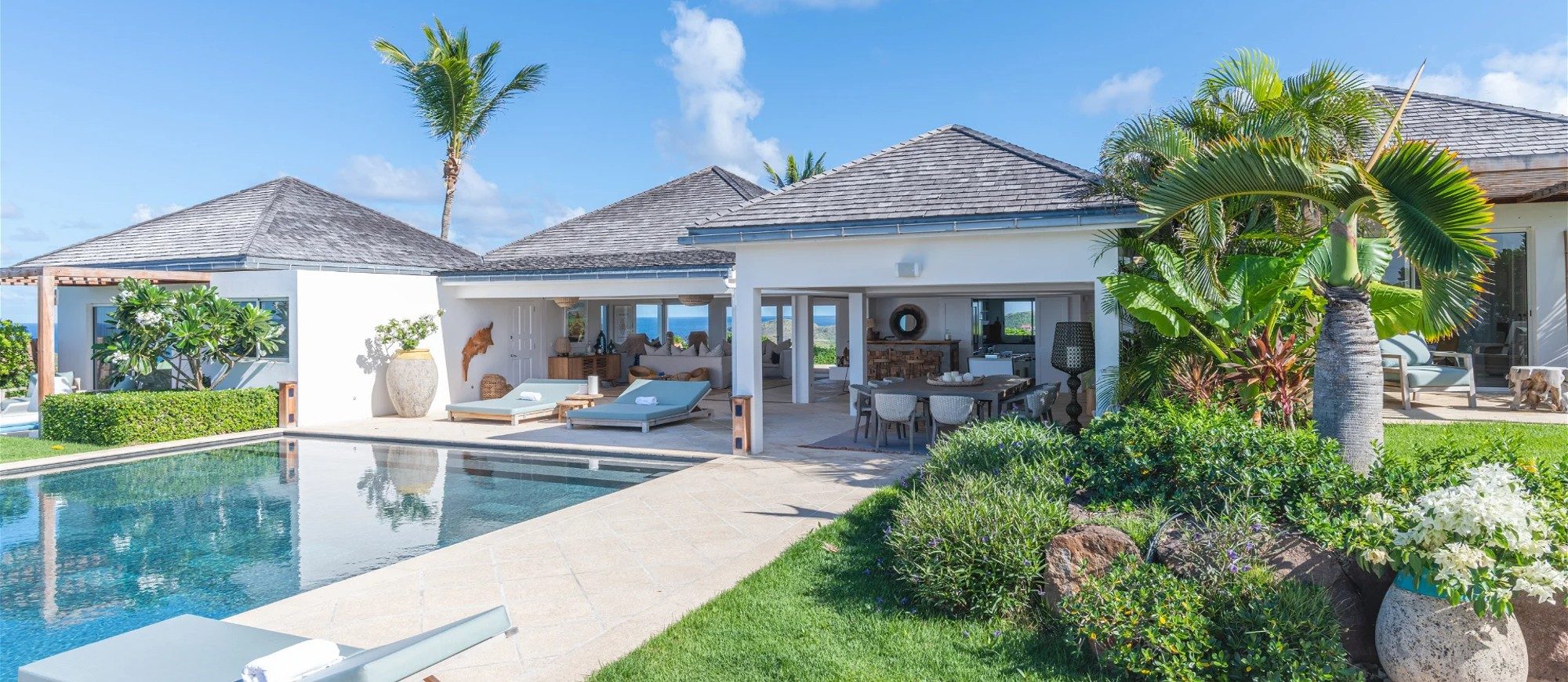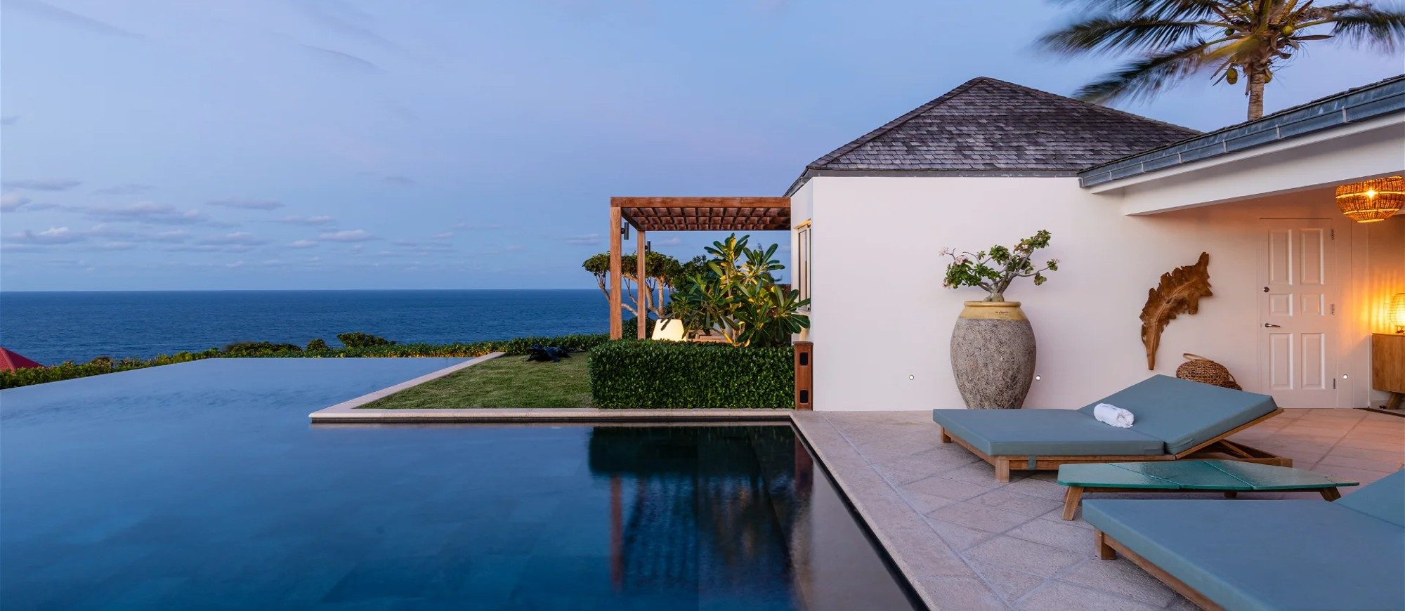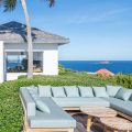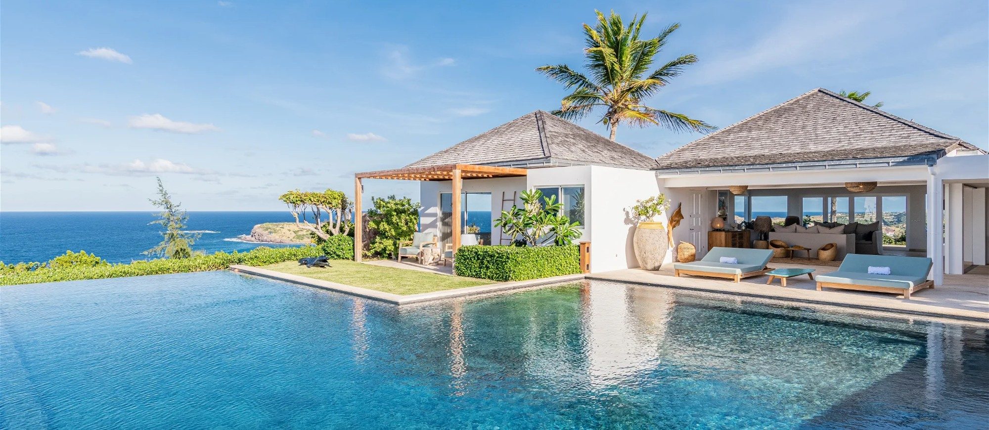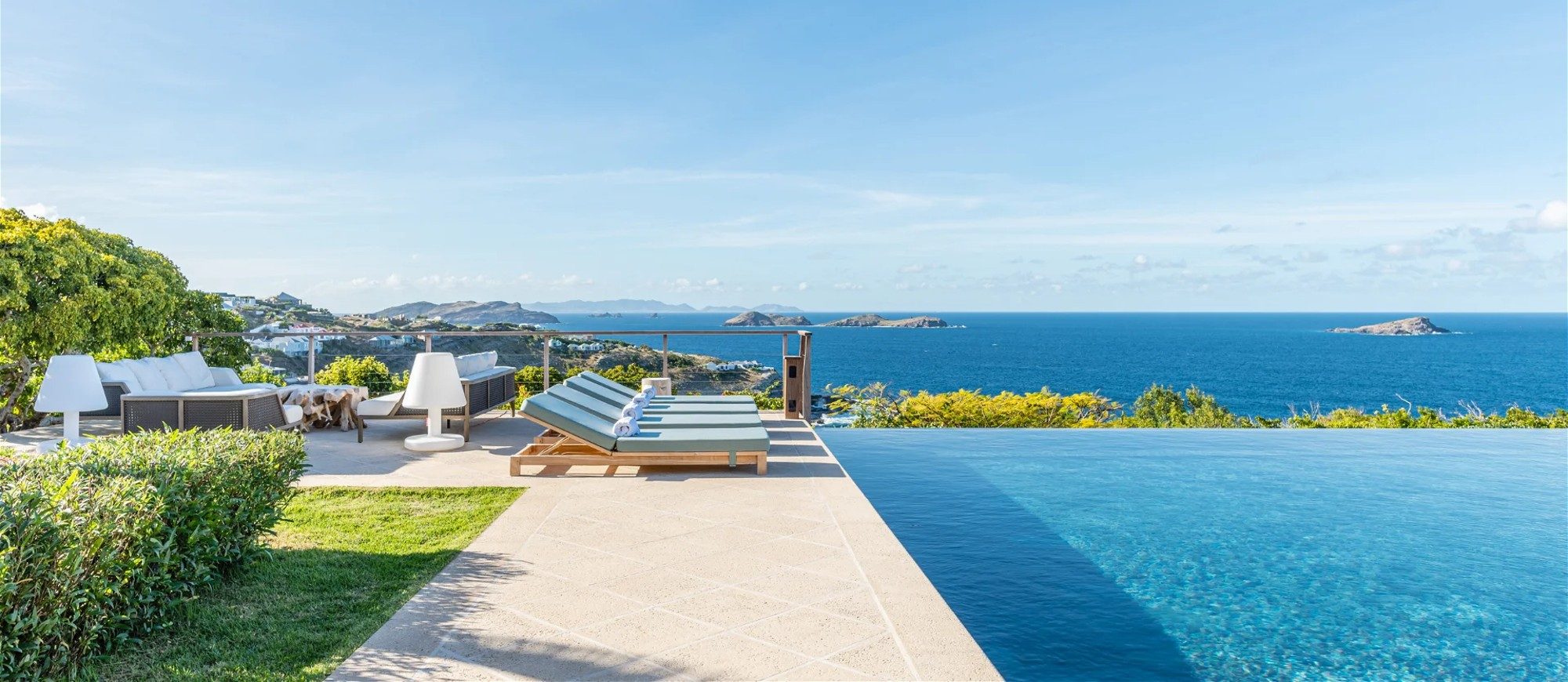 Heated pool surrounded by a spacious sun terrace with deckchairs. An outdoor lounge area with large sofas is on the Terrace facing the spectacular views of Pointe Milou and the ocean.