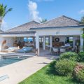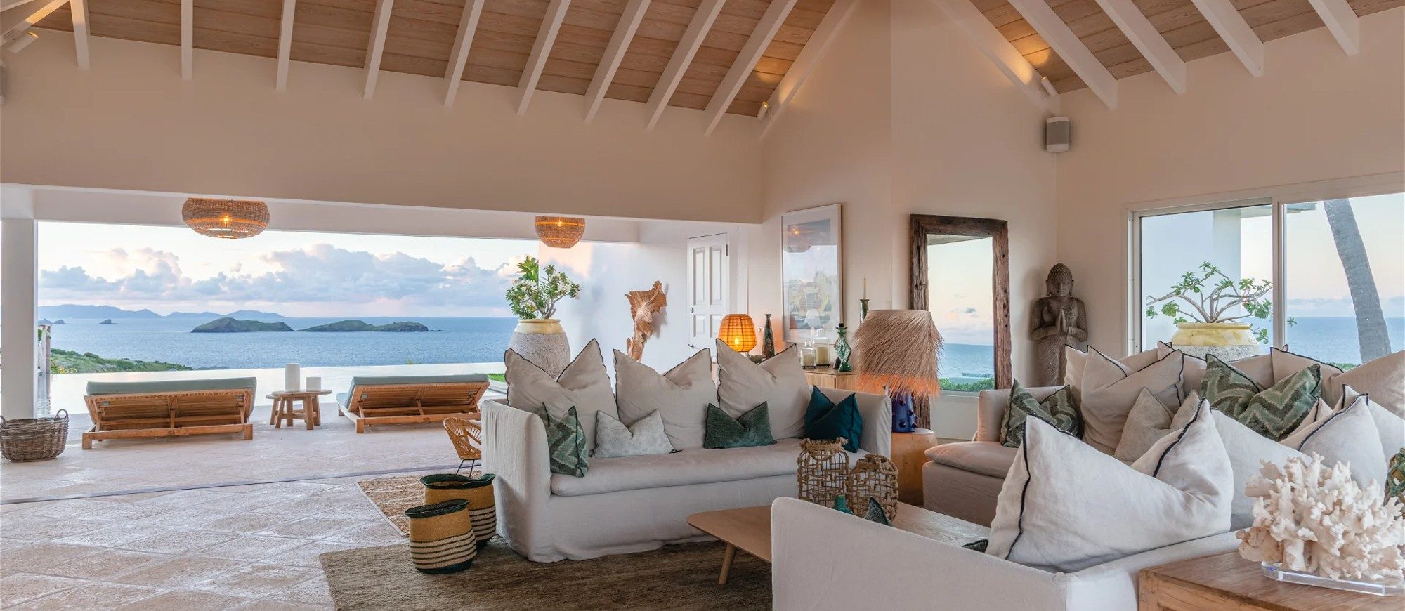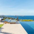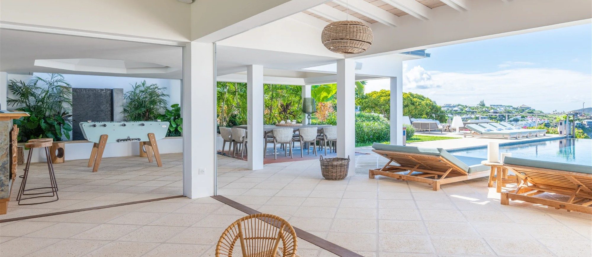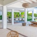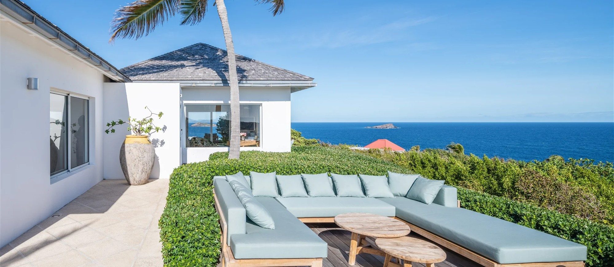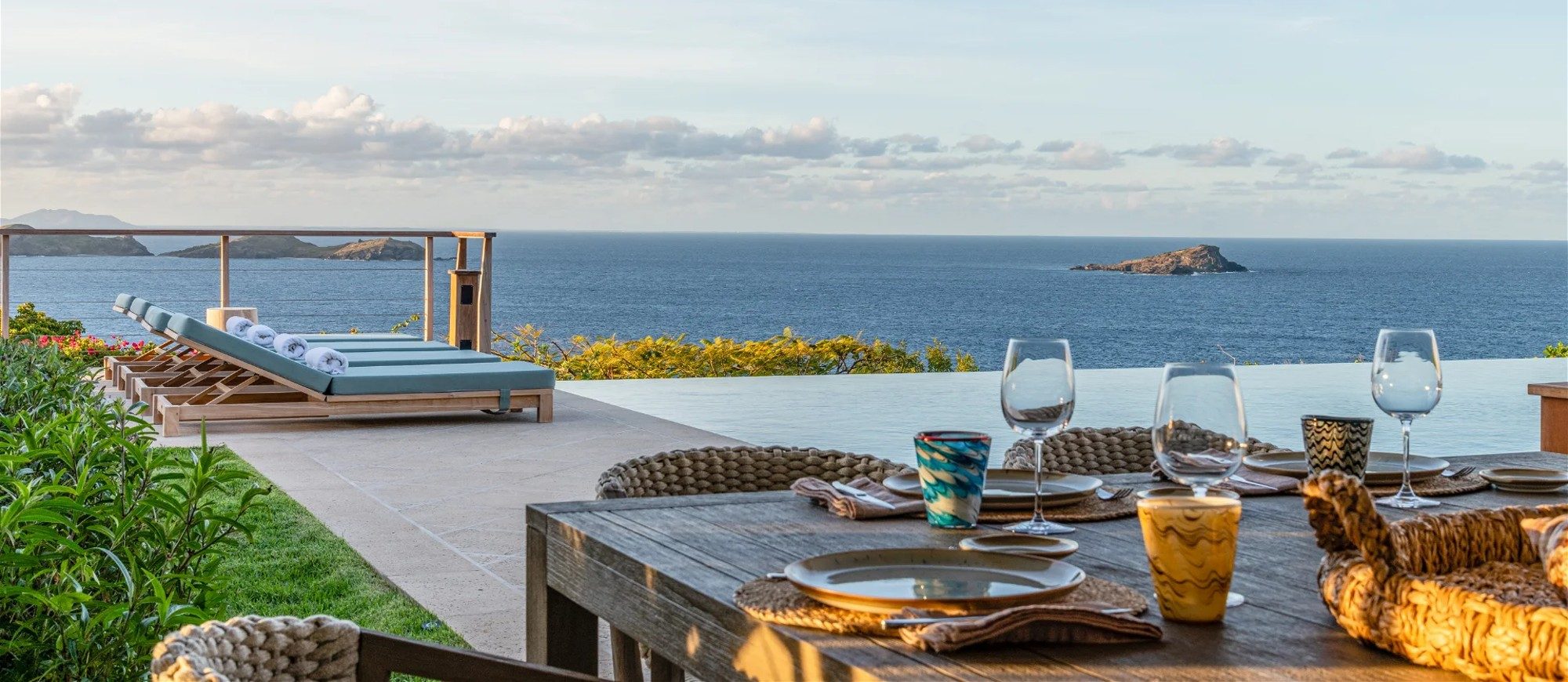 Heated pool surrounded by a spacious sun terrace with deckchairs. An outdoor lounge area with large sofas is on the Terrace facing the spectacular views of Pointe Milou and the ocean.