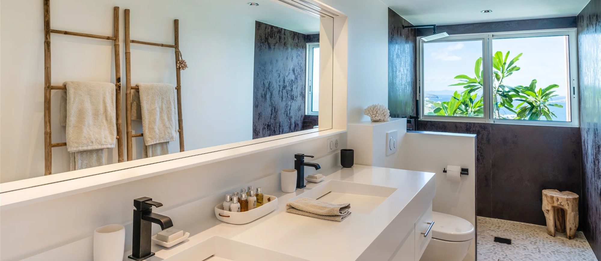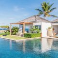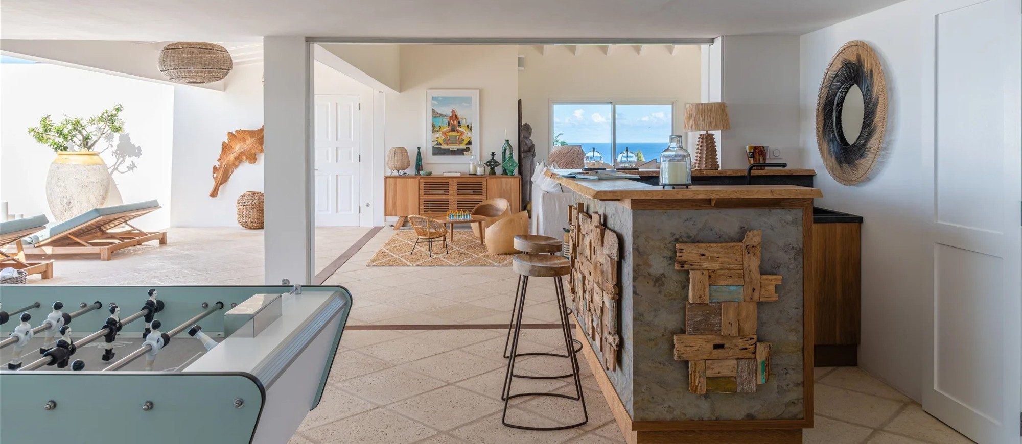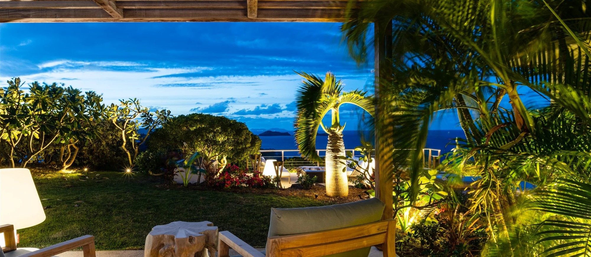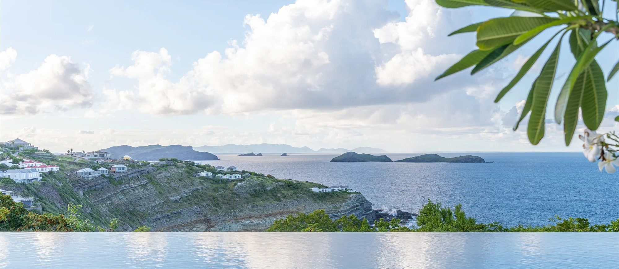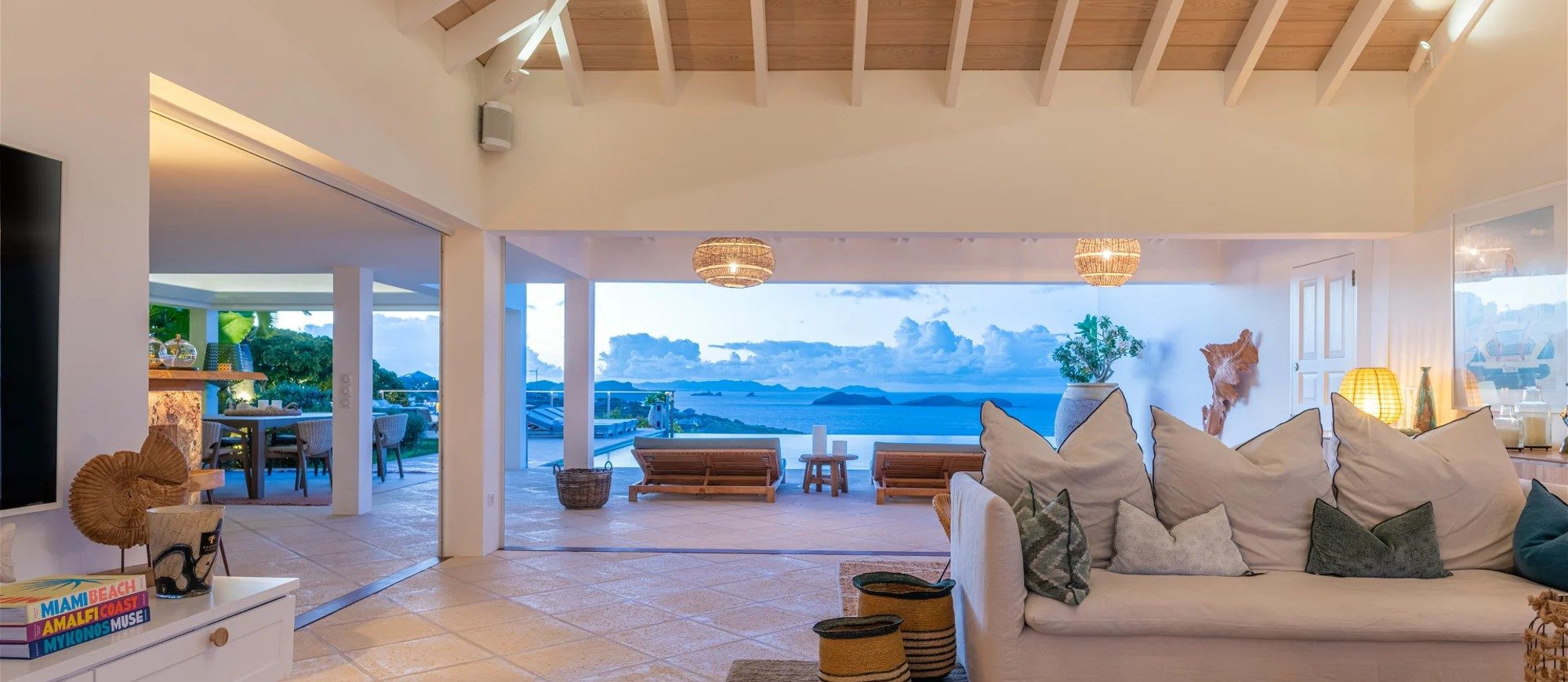 Heated pool surrounded by a spacious sun terrace with deckchairs. An outdoor lounge area with large sofas is on the Terrace facing the spectacular views of Pointe Milou and the ocean.