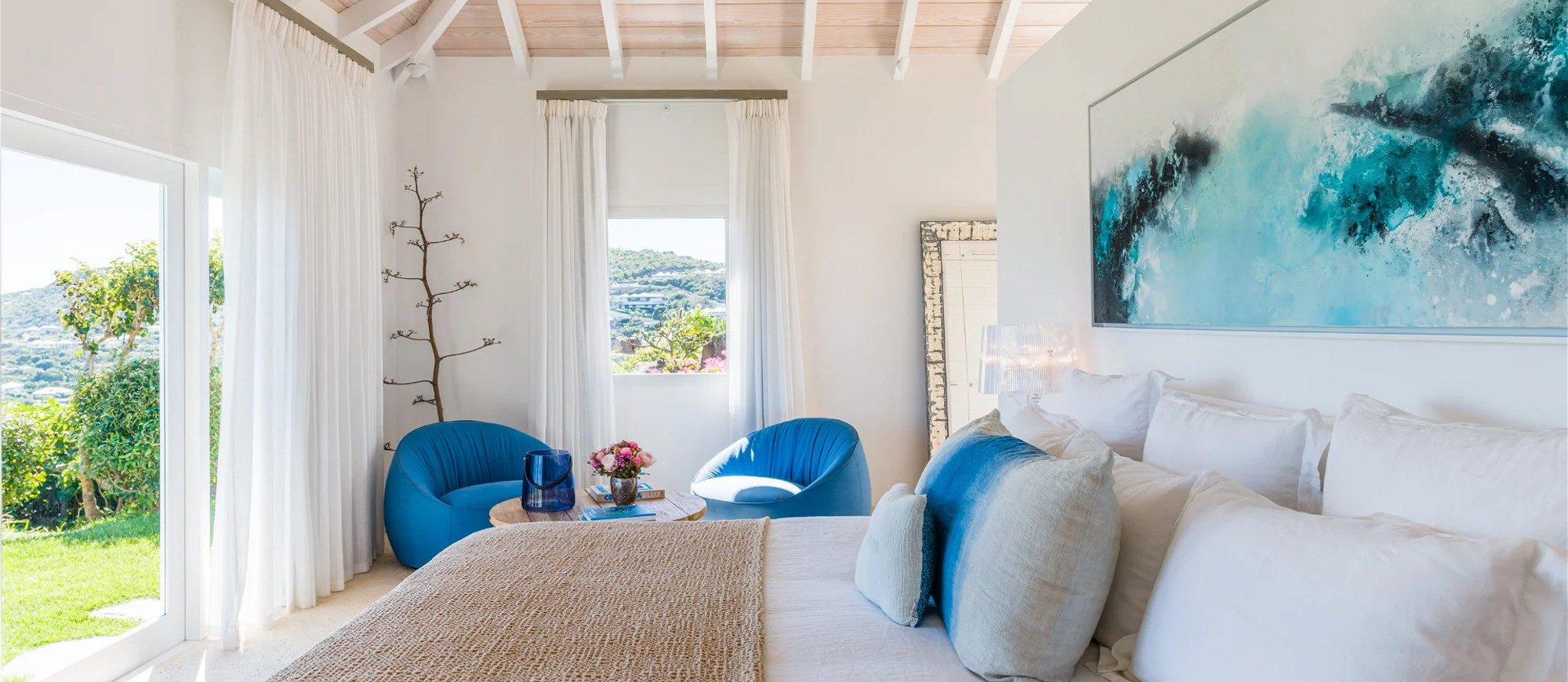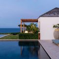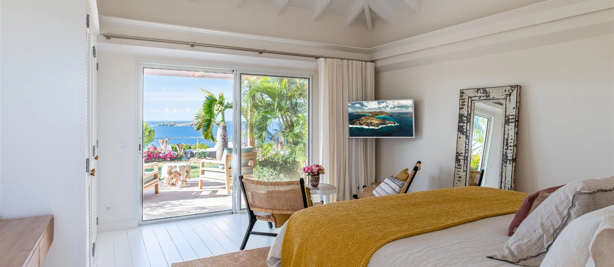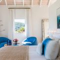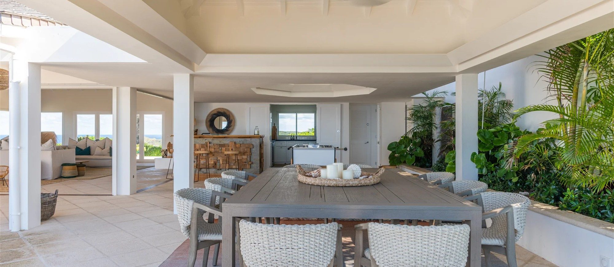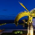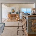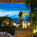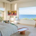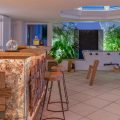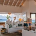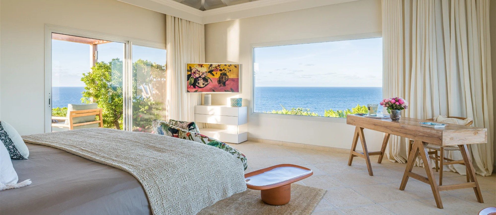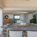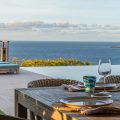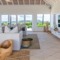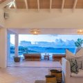 The living room is furnished with three comfy sofas with cushions between the windows swept by the gentle trade winds. The kitchen is well equipped, and perfect for the preparation of meals to be enjoyed alfresco under the covered terrace in the outdoor living room. Large terrace opens with panoramic ocean view and large heated swimming pool. The outdoor living area with sofas, armchairs and contemporary lighting is located at the edge of the terrace, the perfect place to sip a cocktail in the evening while watching the amazing sunsets.