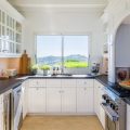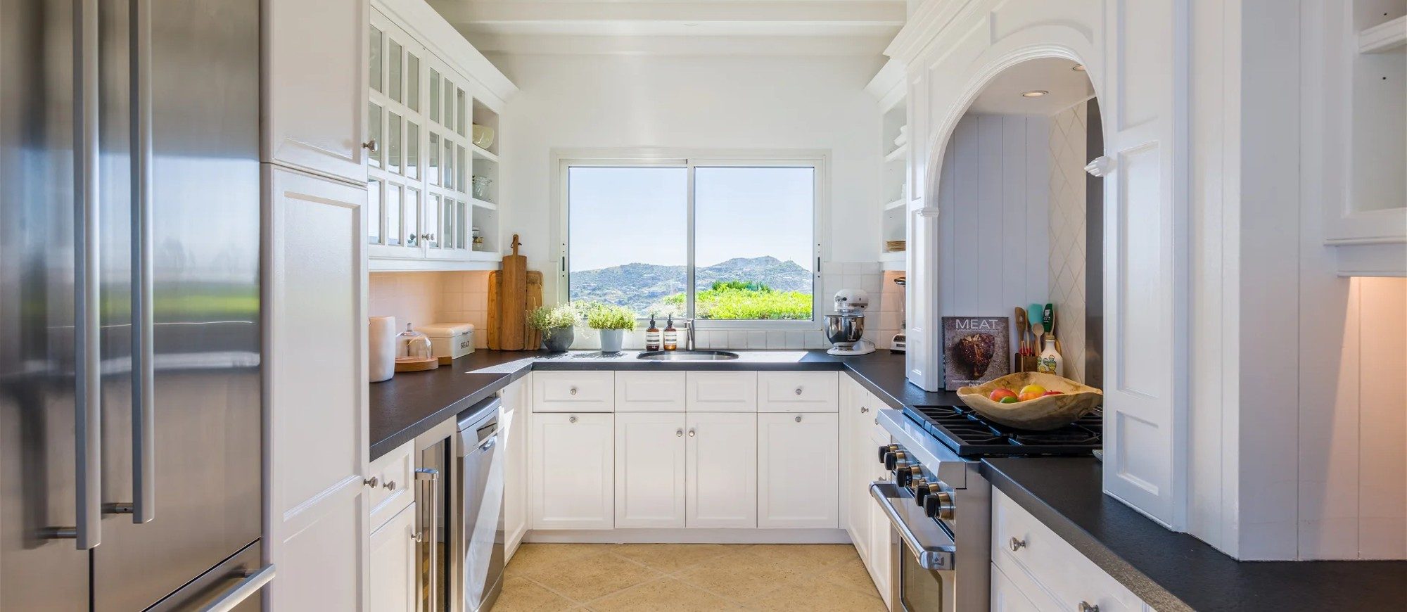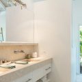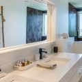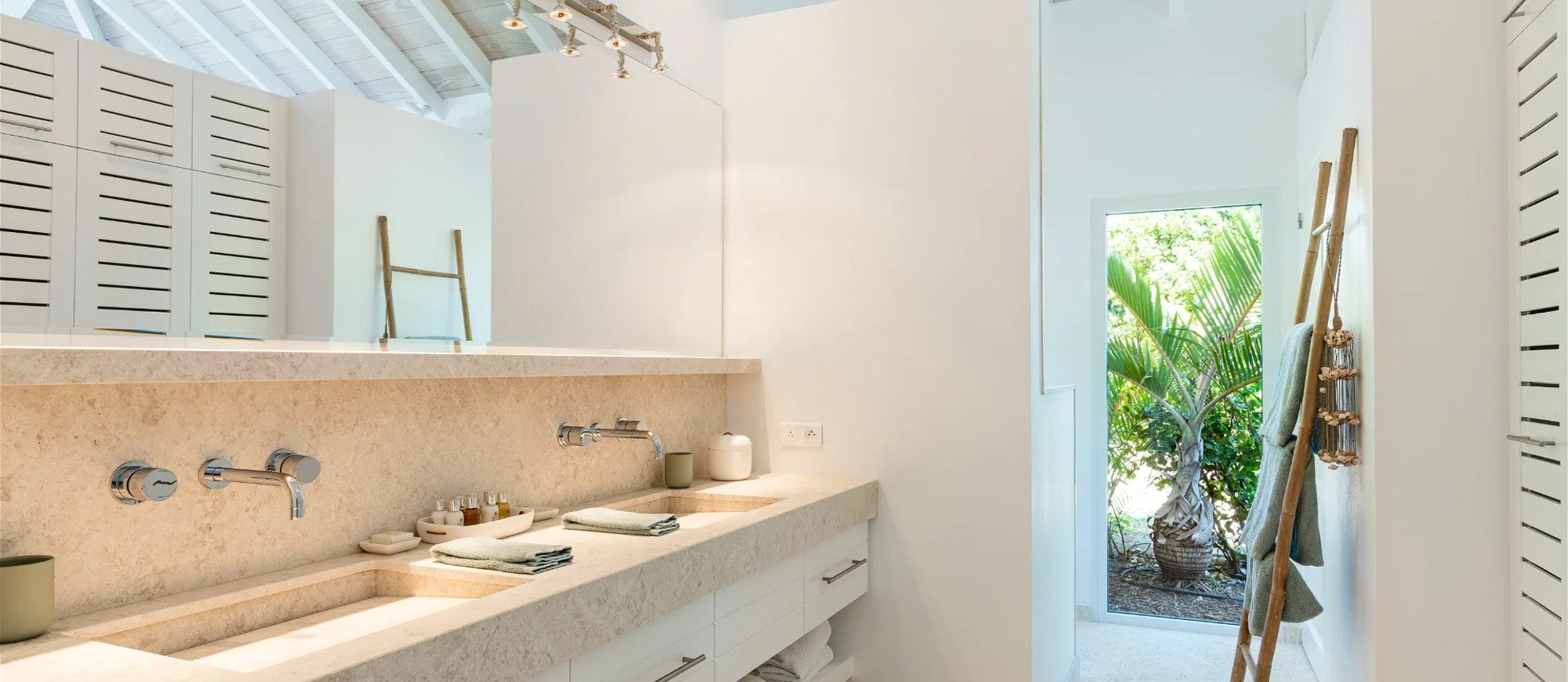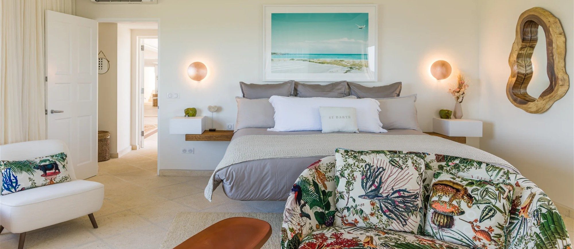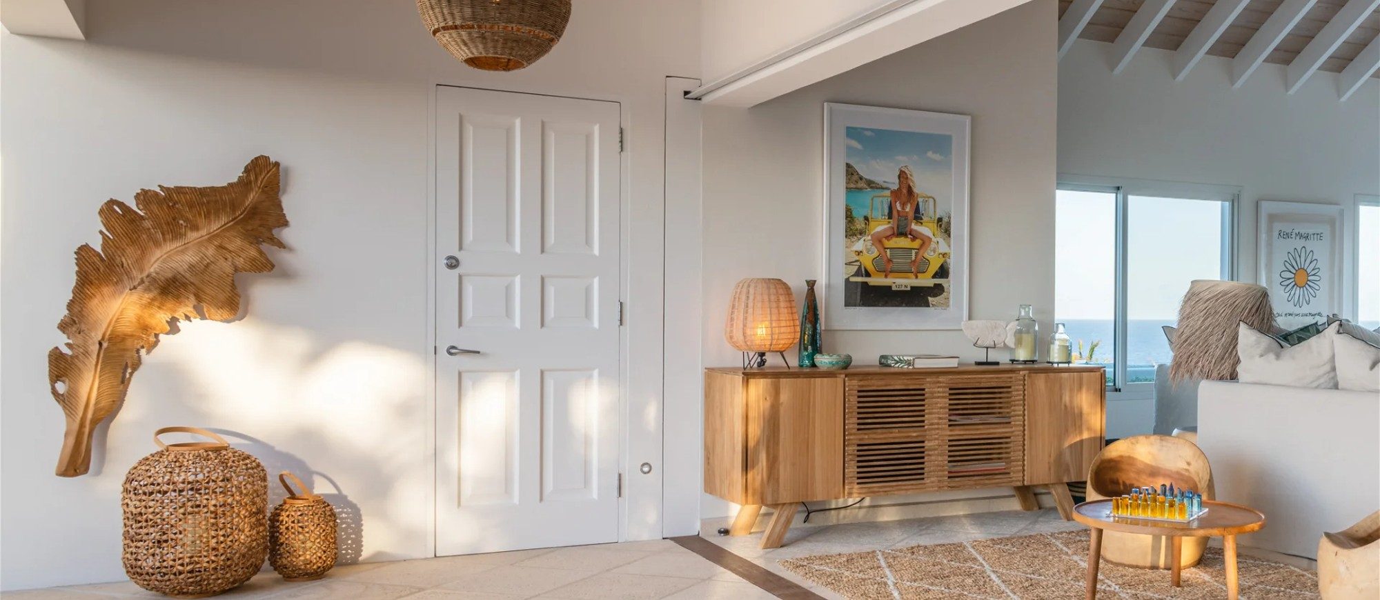The living room is furnished with three comfy sofas with cushions between the windows swept by the gentle trade winds. The kitchen is well equipped, and perfect for the preparation of meals to be enjoyed alfresco under the covered terrace in the outdoor living room. Large terrace opens with panoramic ocean view and large heated swimming pool. The outdoor living area with sofas, armchairs and contemporary lighting is located at the edge of the terrace, the perfect place to sip a cocktail in the evening while watching the amazing sunsets.