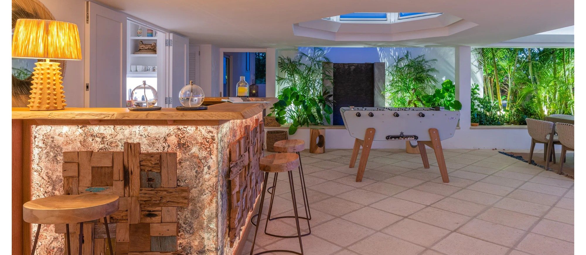 Expansive area opening onto the terrace and the panoramic view. Ceiling fans, HD-TV, Dish network, Apple TV. Bar for your cocktails, foosball.