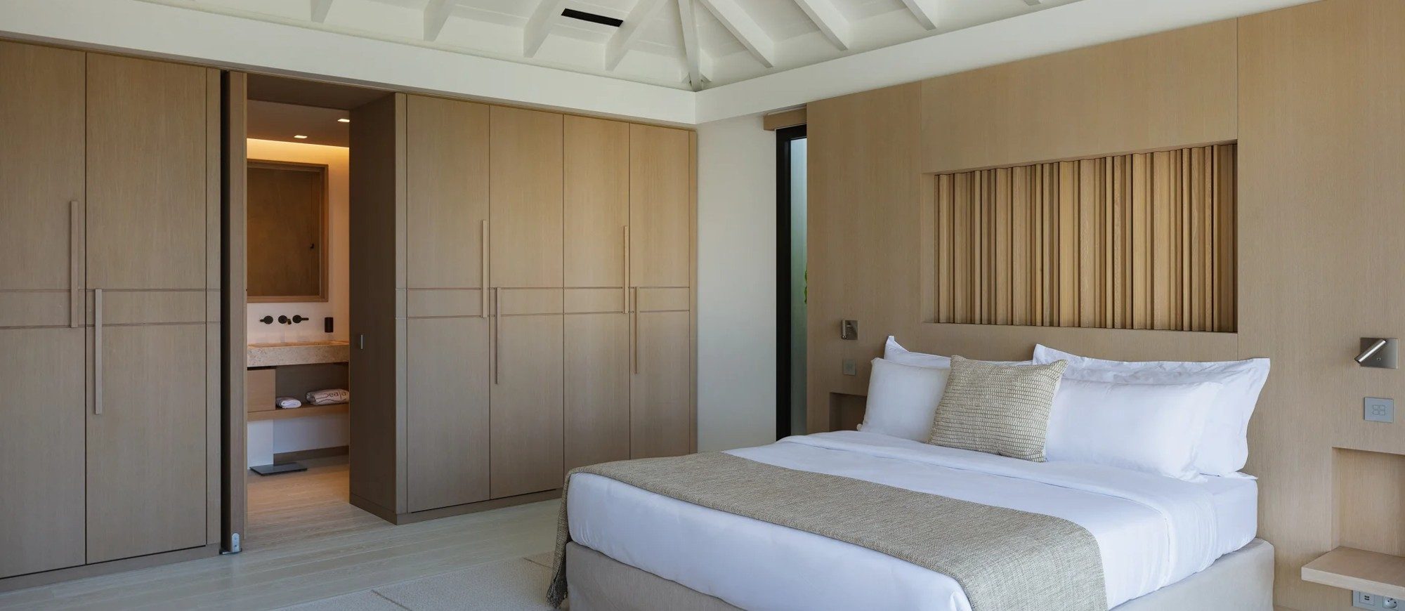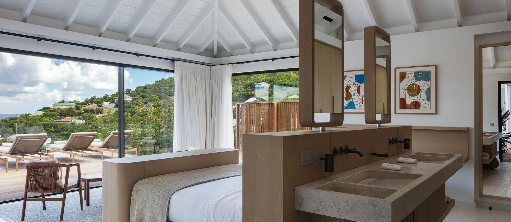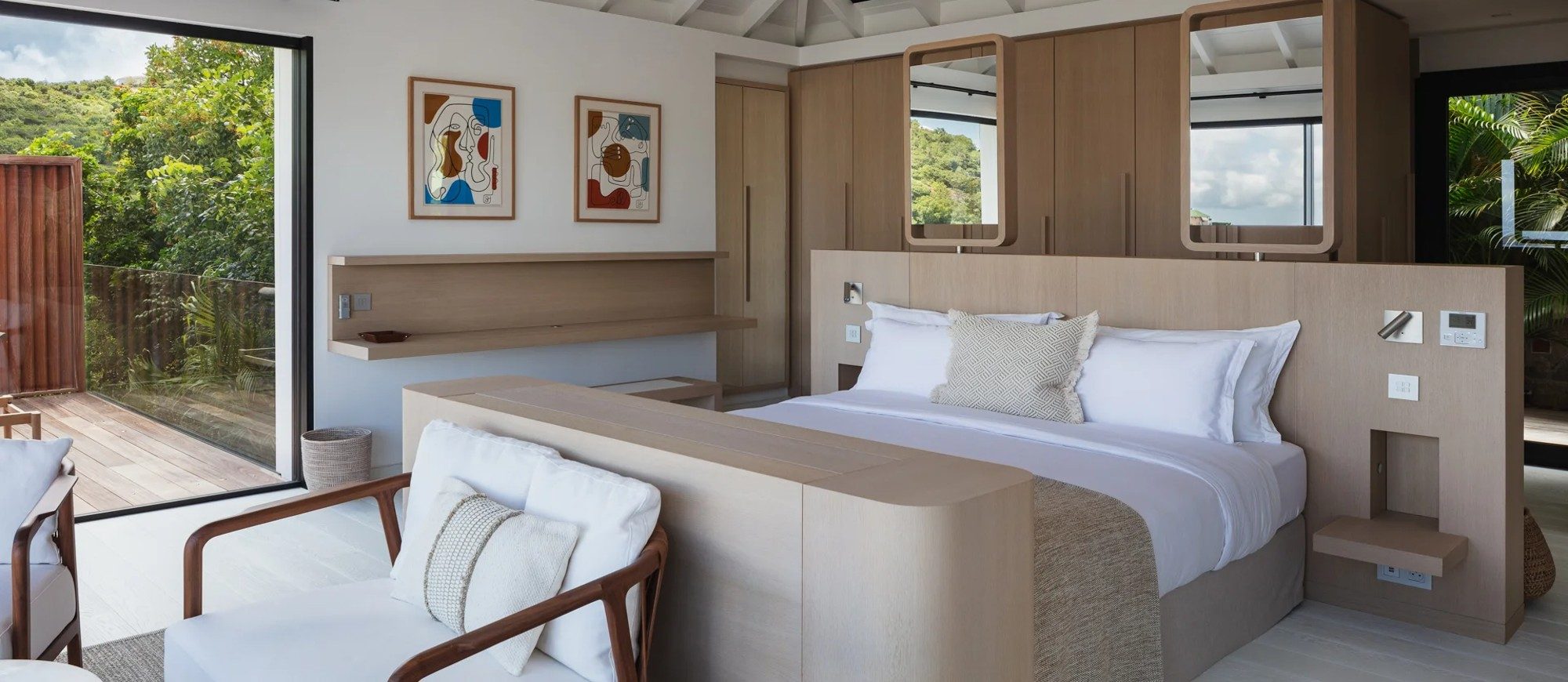 The villa consists of five air-conditioned bedrooms with en suite bathrooms. Two are on the main level, including one in an independent bungalow near the main building. The third one is a few steps down, and the other two are on the lower level, close to the well–equipped fitness room. All open onto St-Jean bay and are furnished with king-size beds in a linen and wood decor.