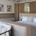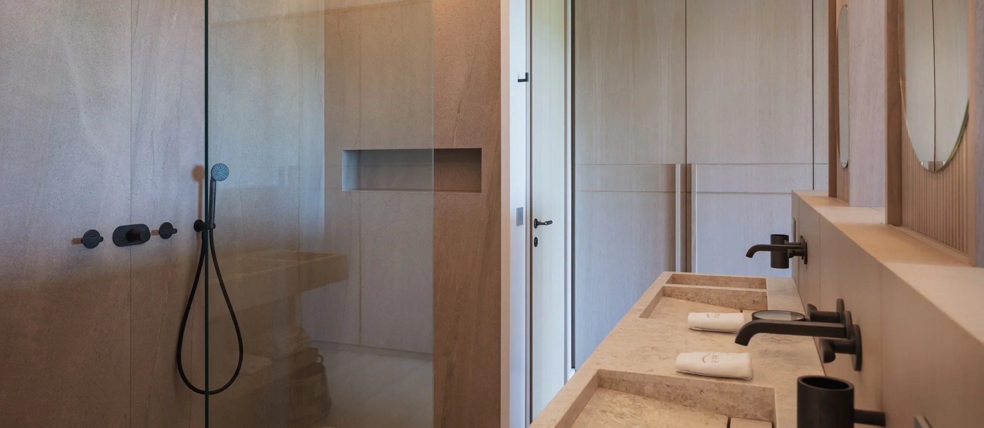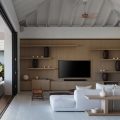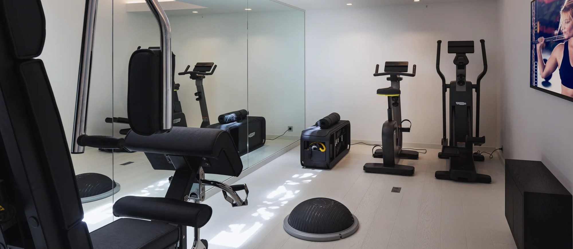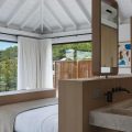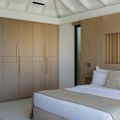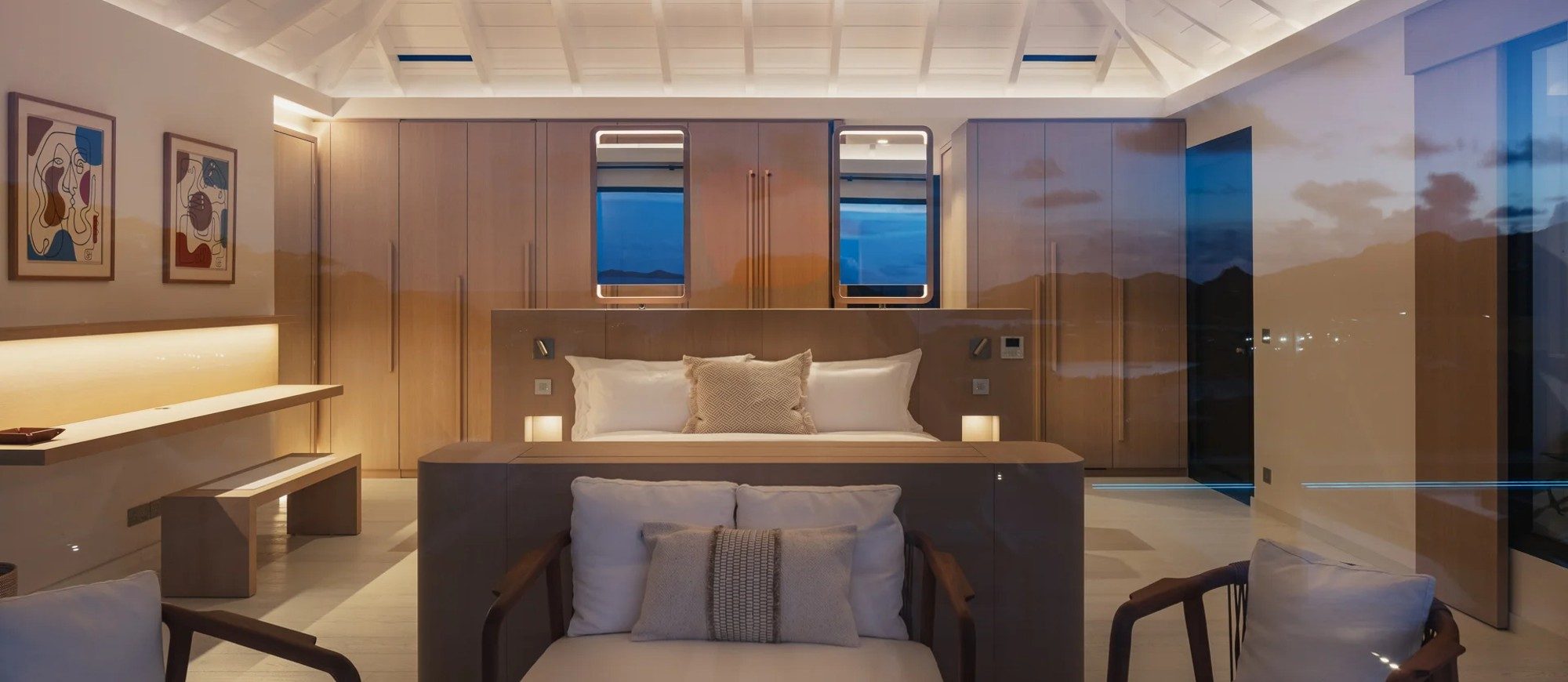 The villa consists of five air-conditioned bedrooms with en suite bathrooms. Two are on the main level, including one in an independent bungalow near the main building. The third one is a few steps down, and the other two are on the lower level, close to the well–equipped fitness room. All open onto St-Jean bay and are furnished with king-size beds in a linen and wood decor.