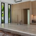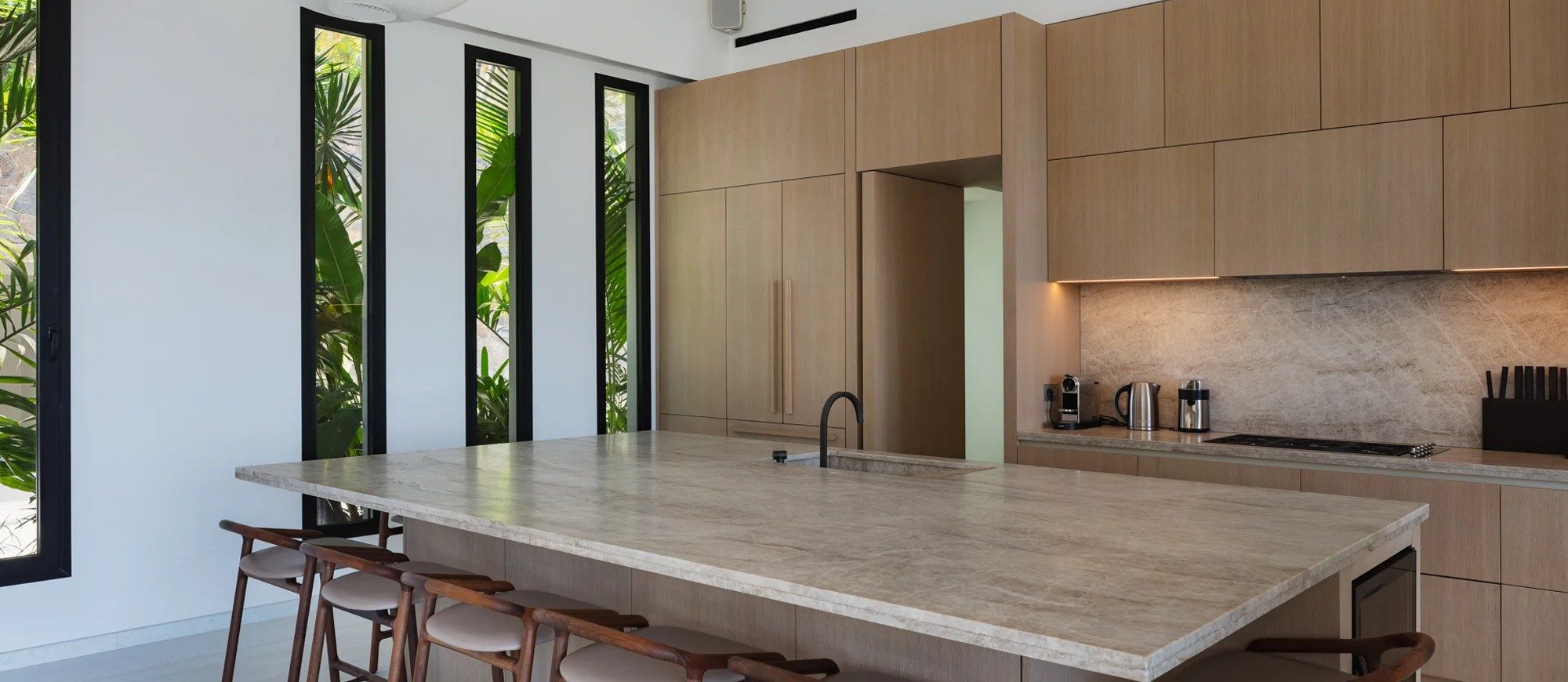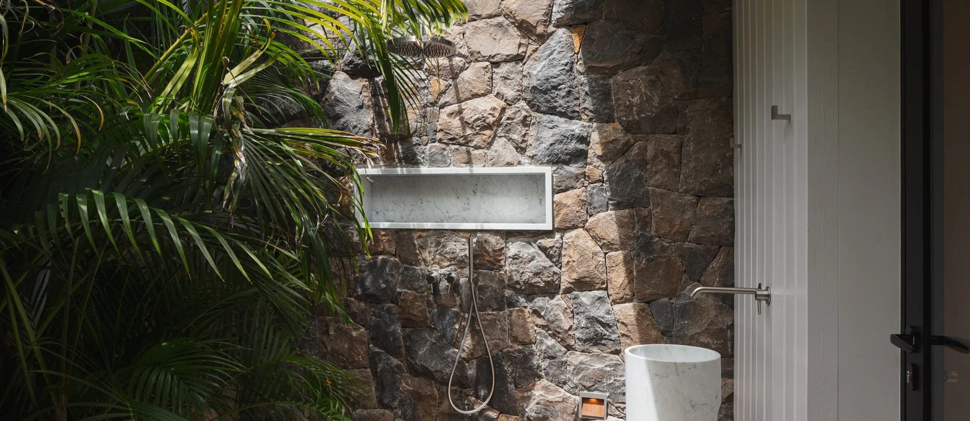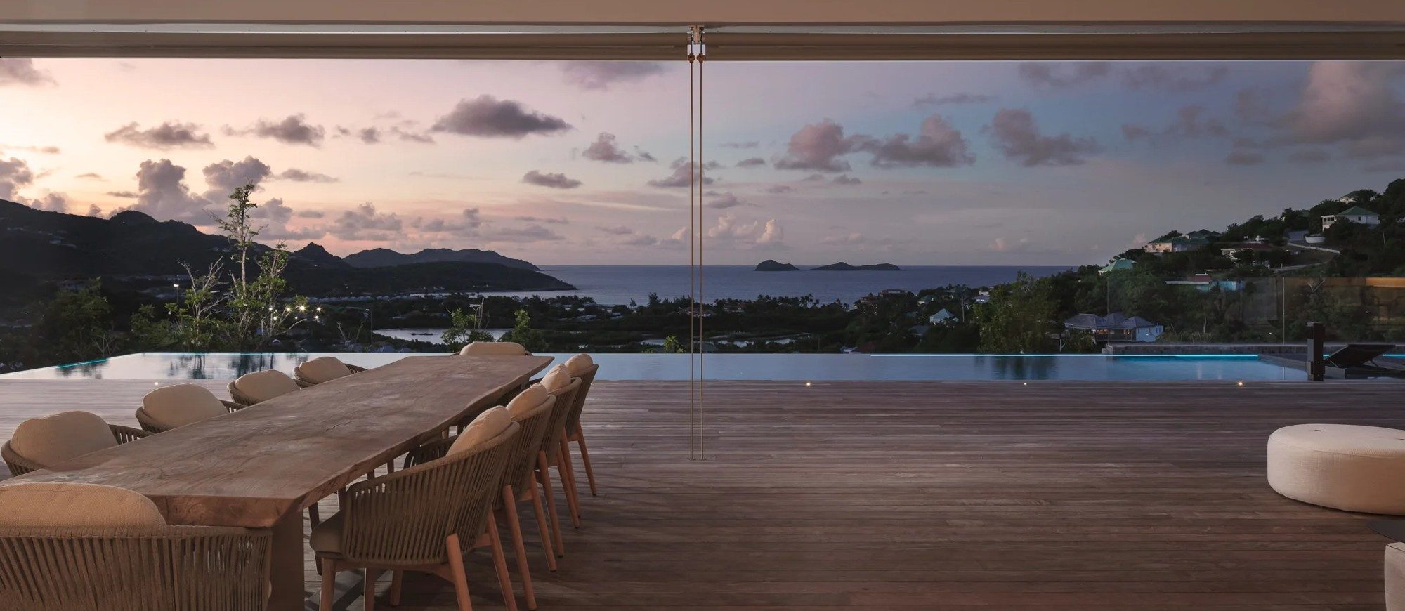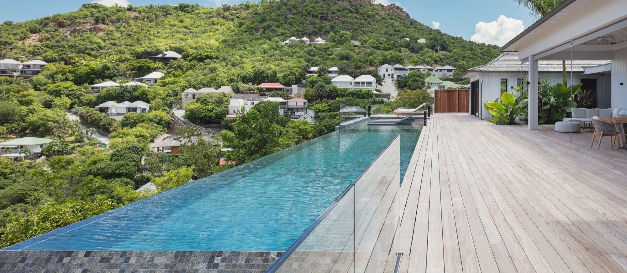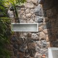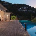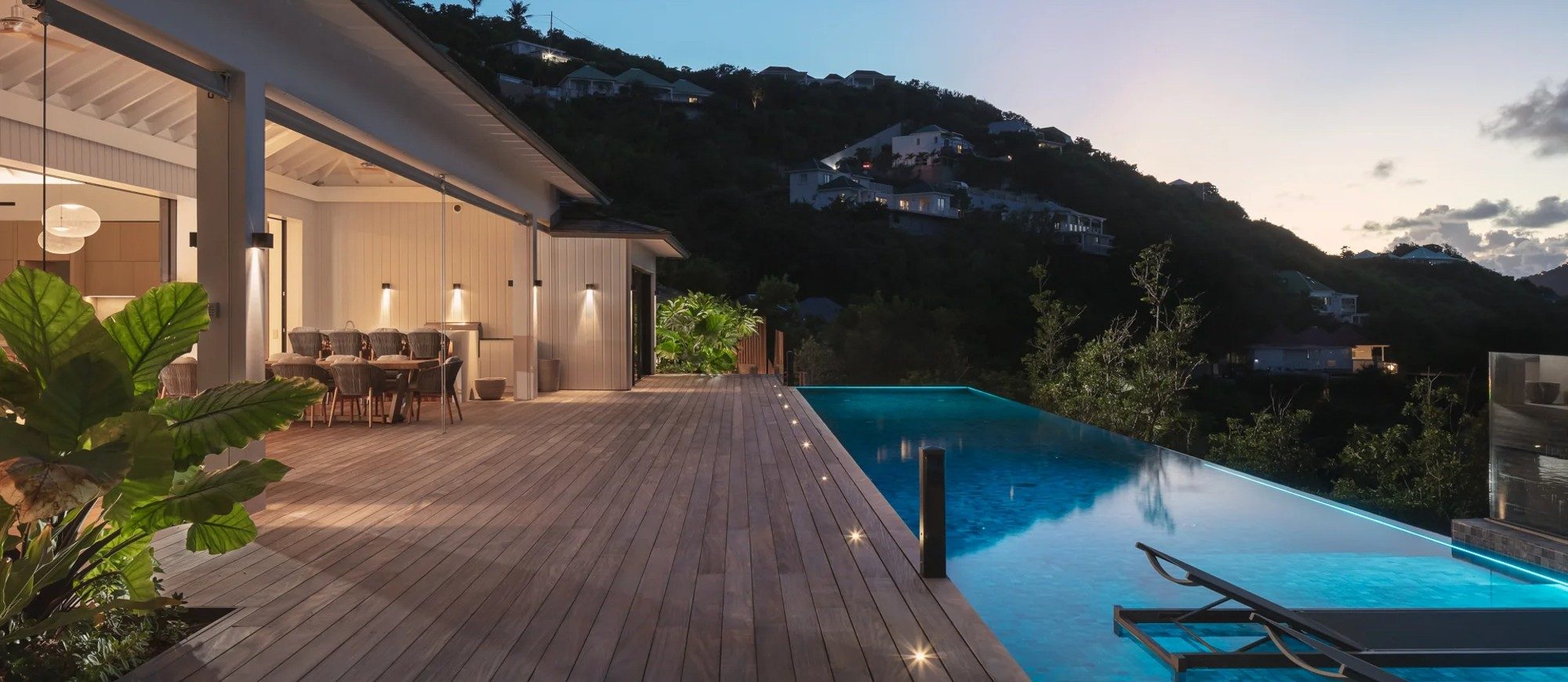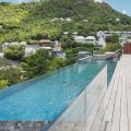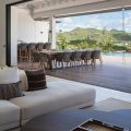 At the front, the terrace offers an extraordinary panoramic ocean view. The heated infinity swimming pool sparkles in the sunshine, and features a shallow end with underwater loungers. Sun loungers are also available on the side of the pool. You’ll enjoy the gentle rustle of palm and local shrubs’ leaves as the trade winds blow and bring an exotic touch to this exceptional villa.