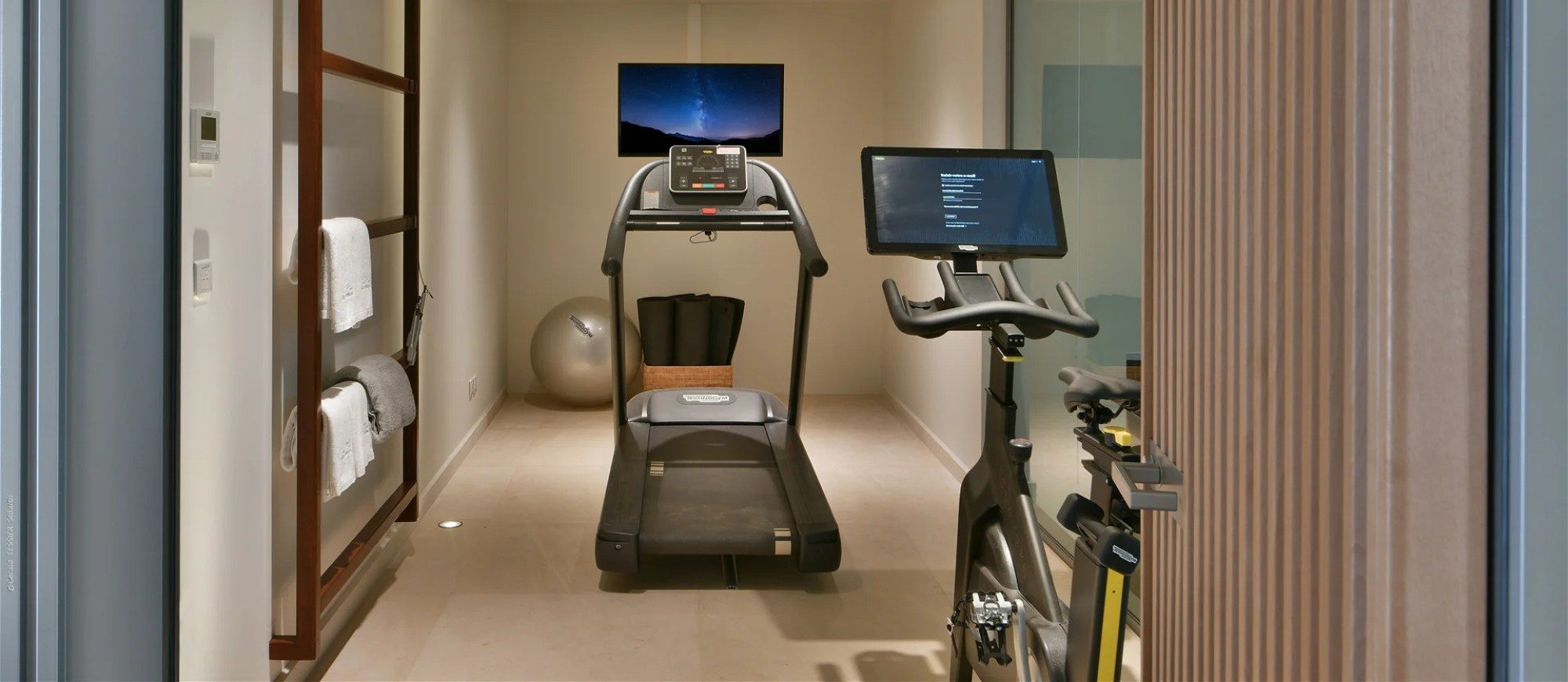 The large air-conditioned living room, under a vaulted ceiling, has elegant sofas and has a stunning ocean view. The spacious kitchen is well equipped with the best appliances and a breakfast bar. The movie room has HD-TV, Dish Network, Apple TV, DVD player. The fitness room has treadmill, sports accessories, including weight benches, weights and dumbbells and HD-TV with Dish Network.