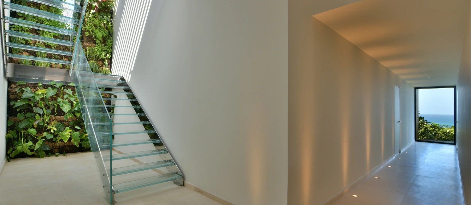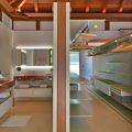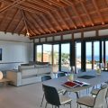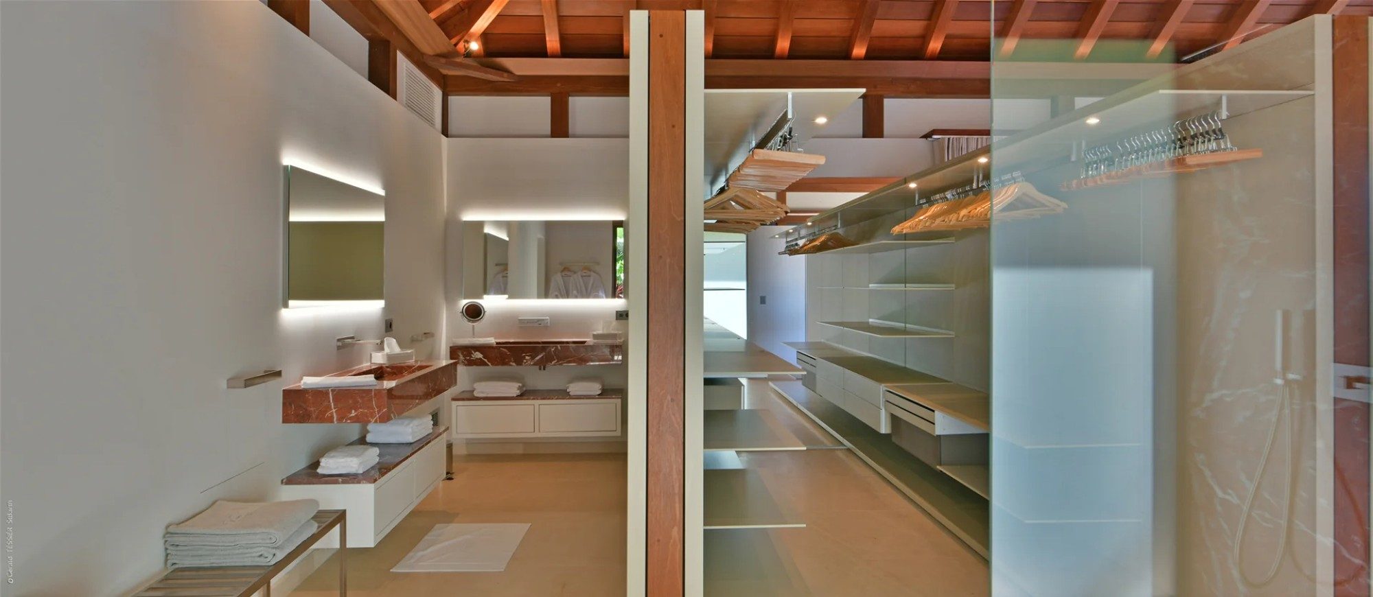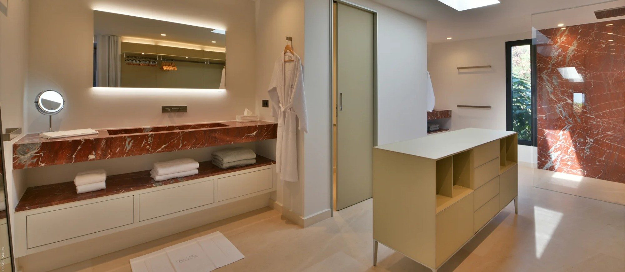 There are four air-conditioned bedrooms with en-suite bathrooms. They are all spacious and equipped with king size beds, sitting areas and private terraces, with wood, pink marble and velvet fabrics. Two bedrooms are located on the main level and open onto the terrace and the pool, while the other two are on the lower level, and can be accessed through a beautiful glass staircase.
