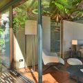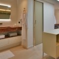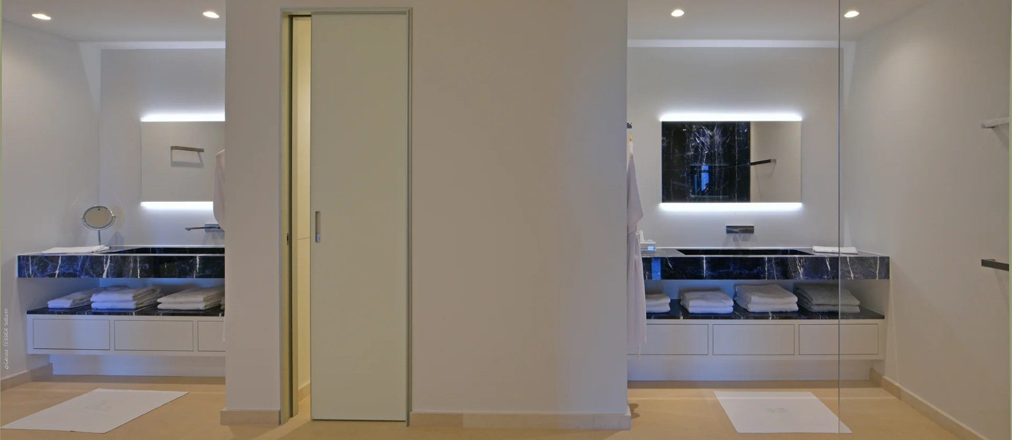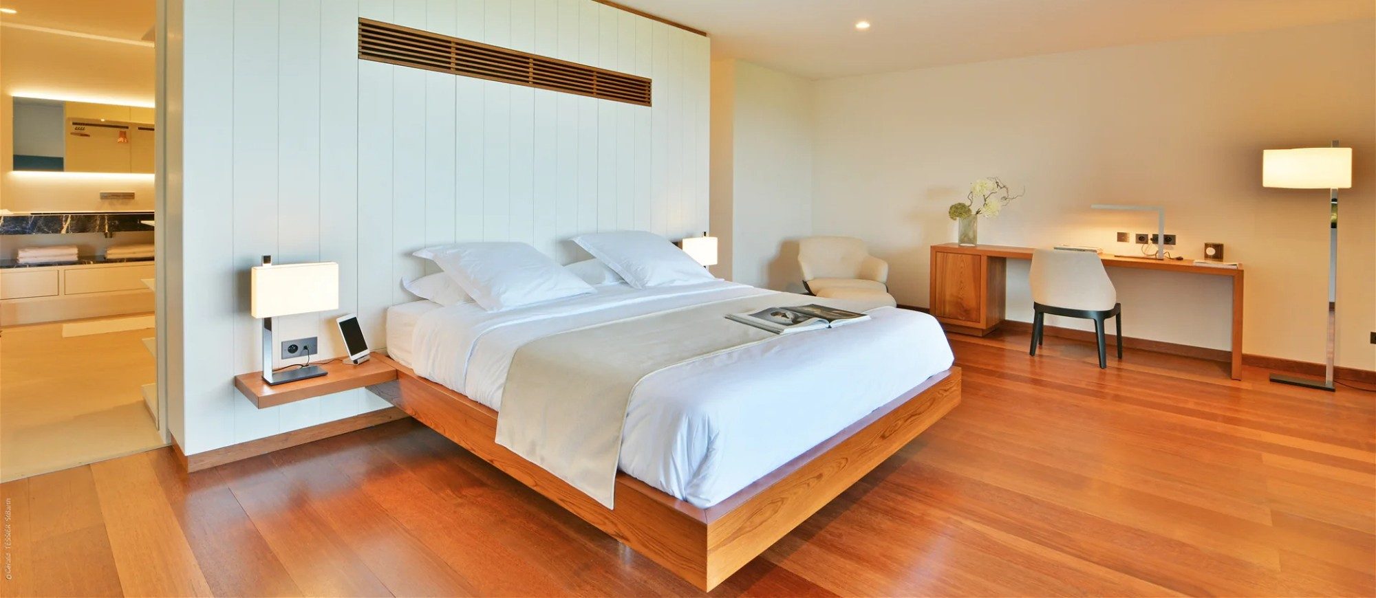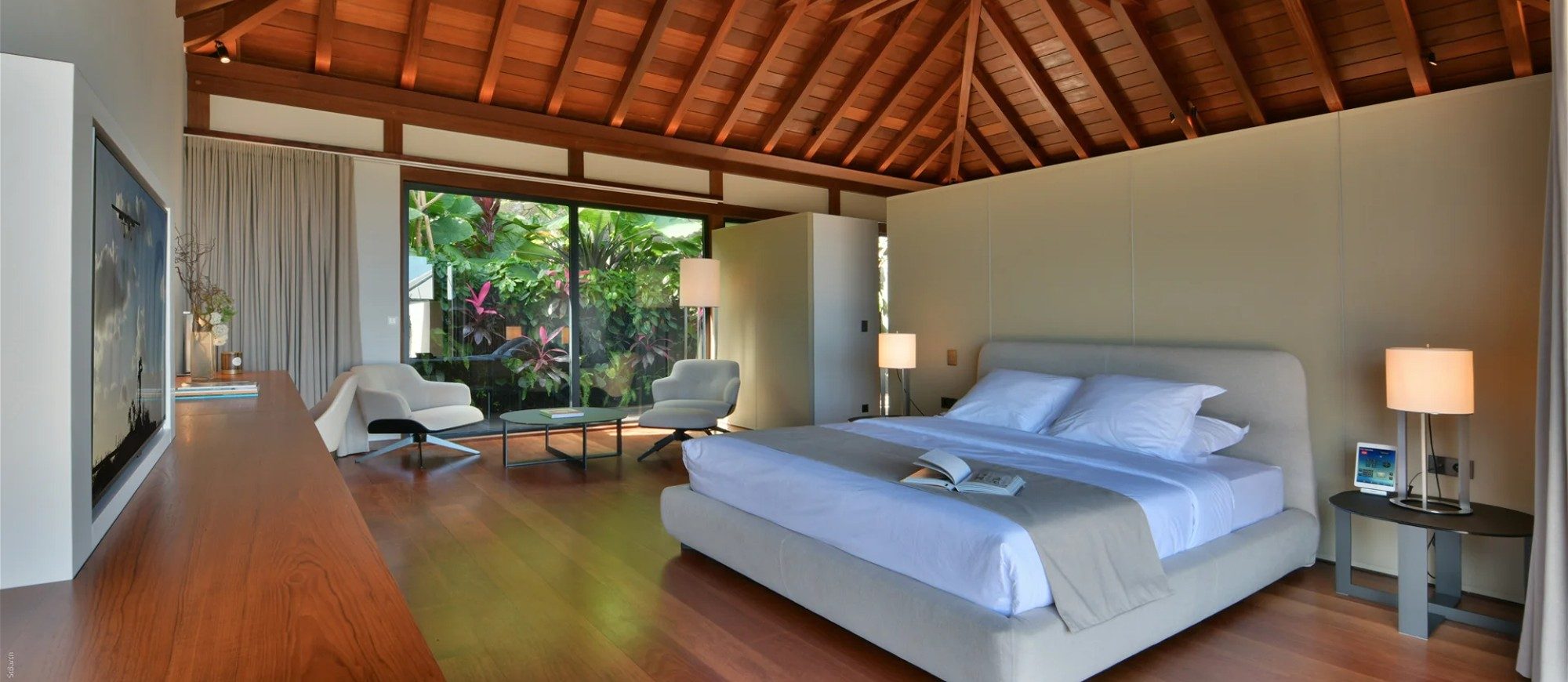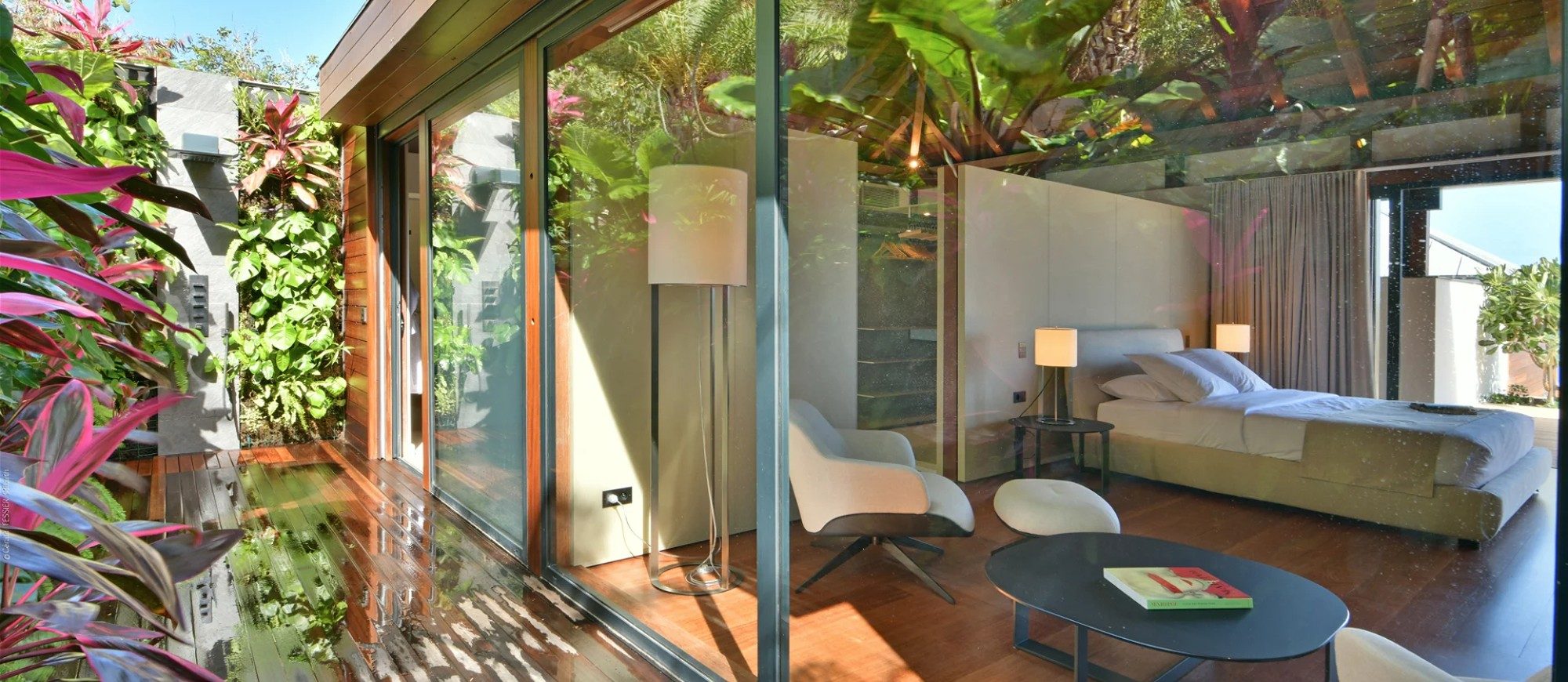 There are four air-conditioned bedrooms with en-suite bathrooms. They are all spacious and equipped with king size beds, sitting areas and private terraces, with wood, pink marble and velvet fabrics. Two bedrooms are located on the main level and open onto the terrace and the pool, while the other two are on the lower level, and can be accessed through a beautiful glass staircase.