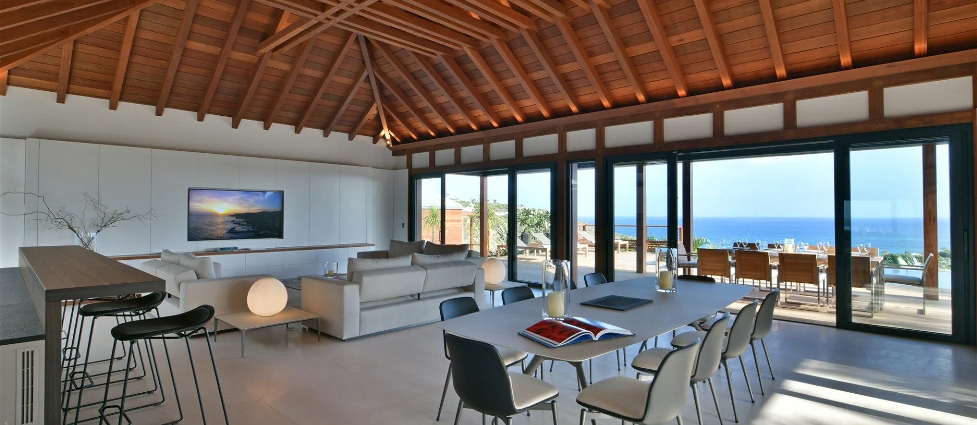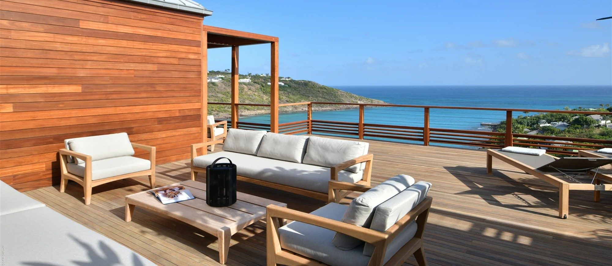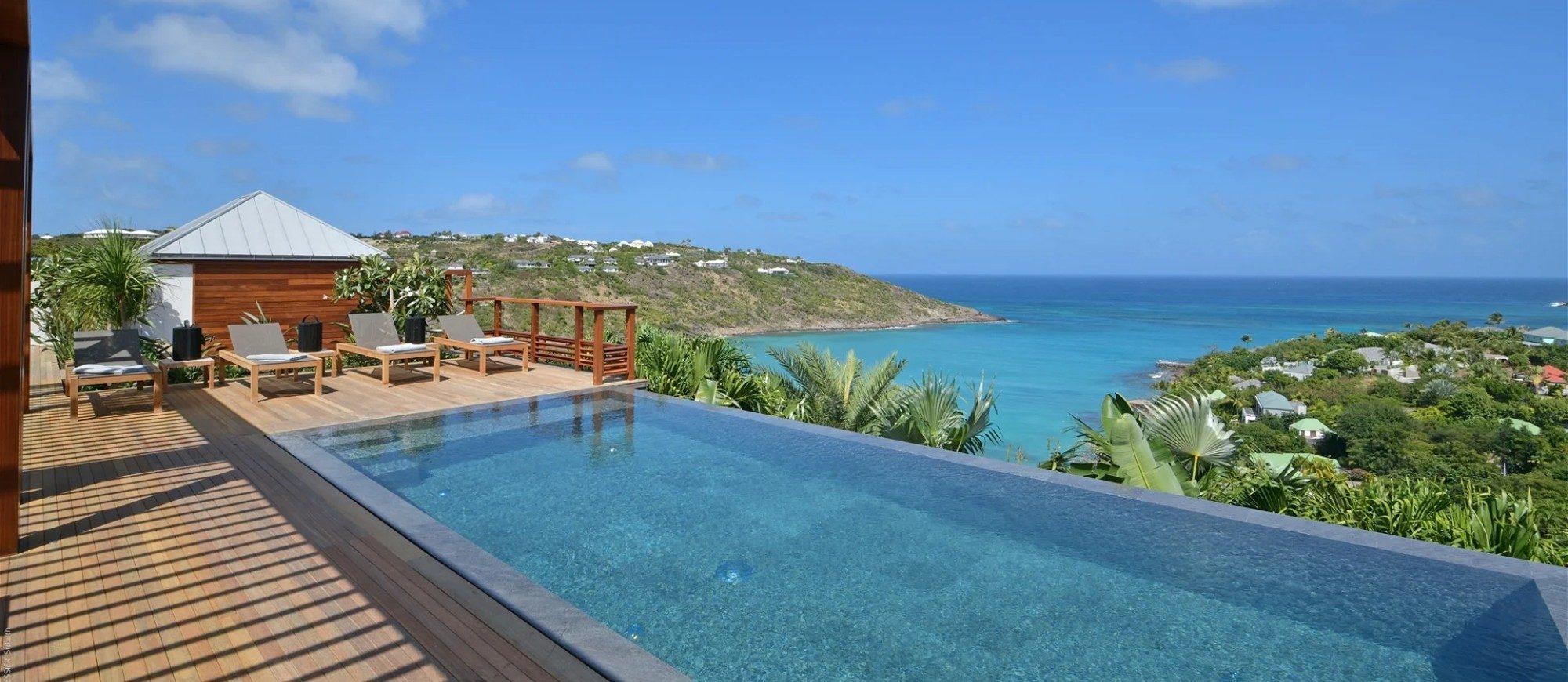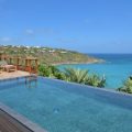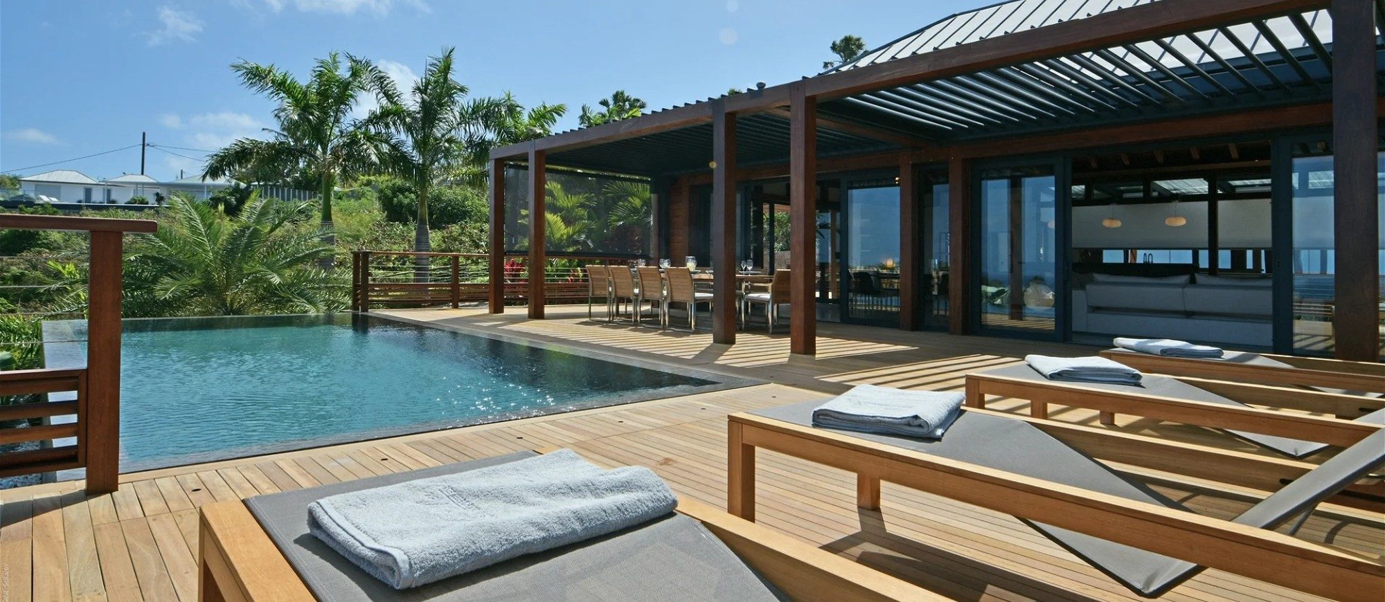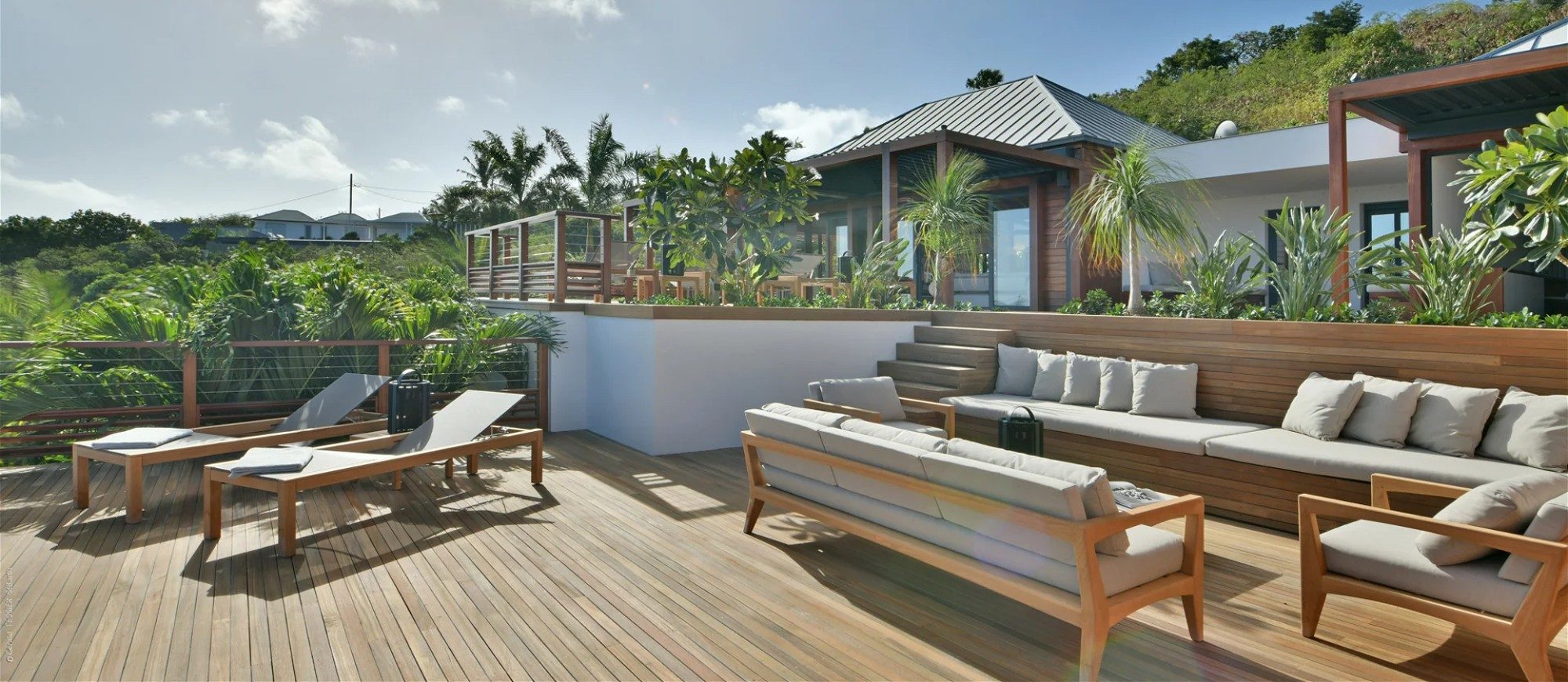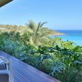 This is a new four-bedroom property located on the hill of Marigot. It is only a few minutes away from the lagoon of Grand-Cul-de-Sac and its famous kitesurfing spot, as well as beach restaurants. The property has several pavilions with a lovely view over the bay below; it is decorated in a contemporary style.