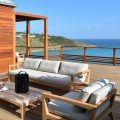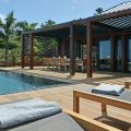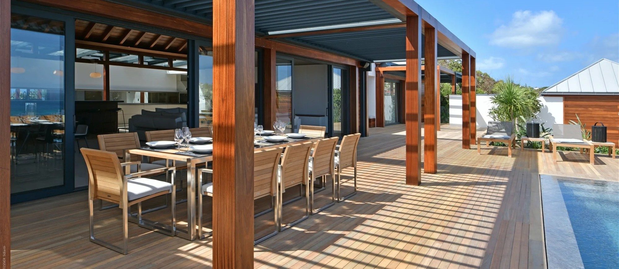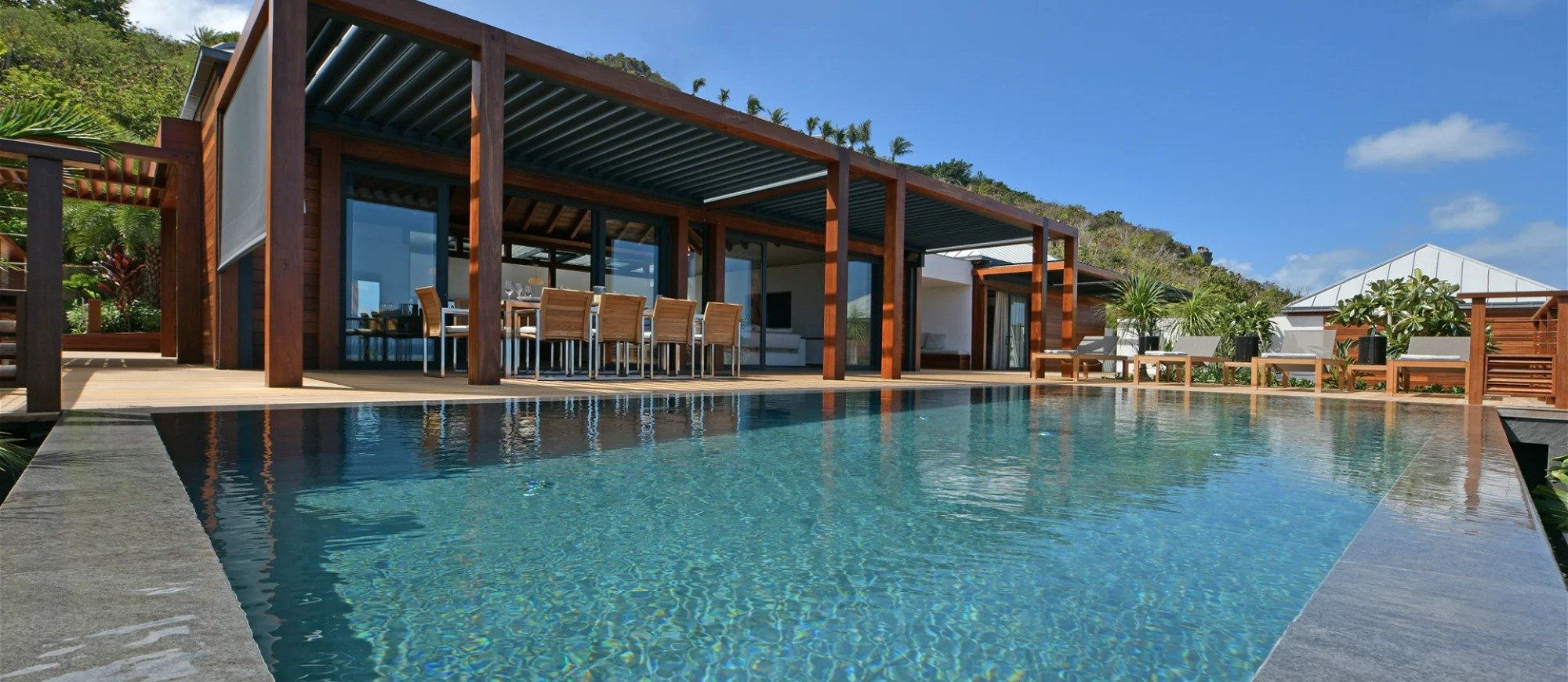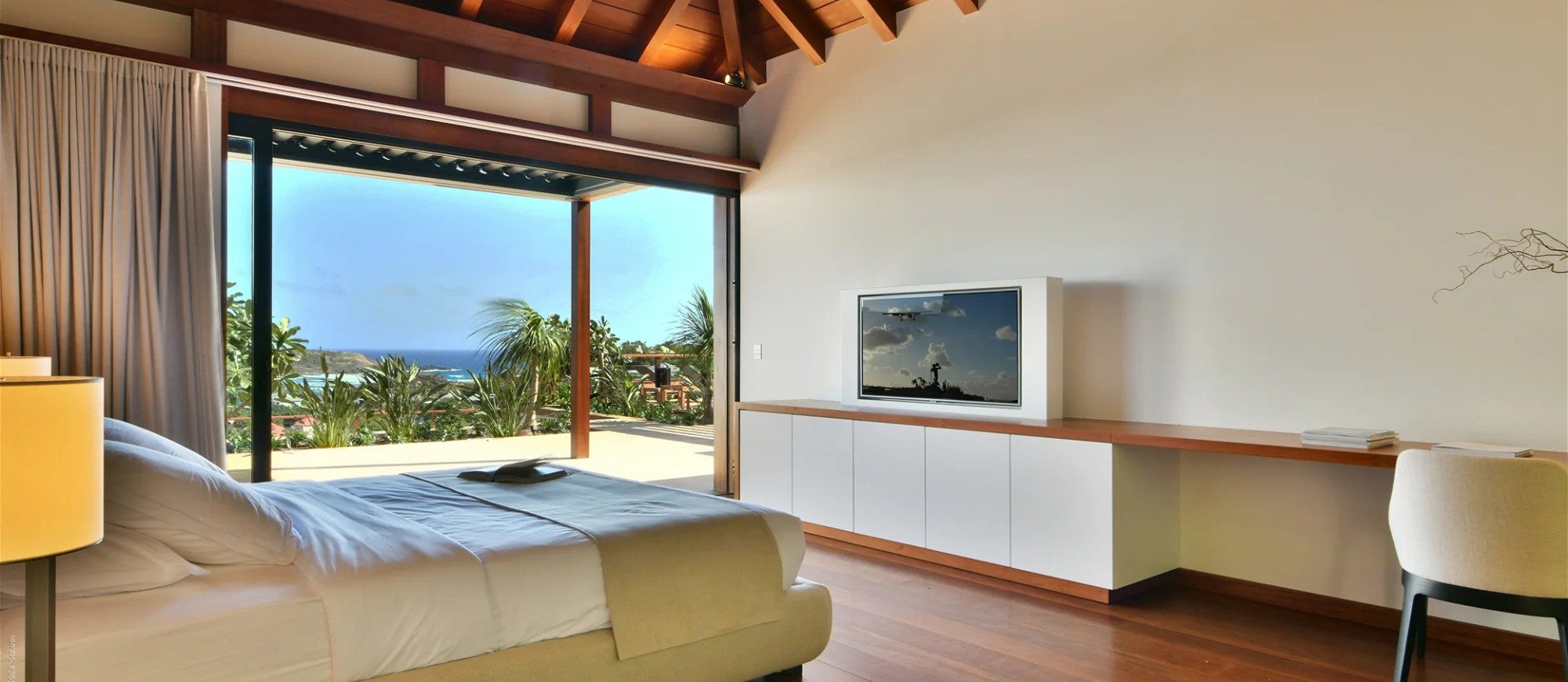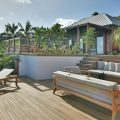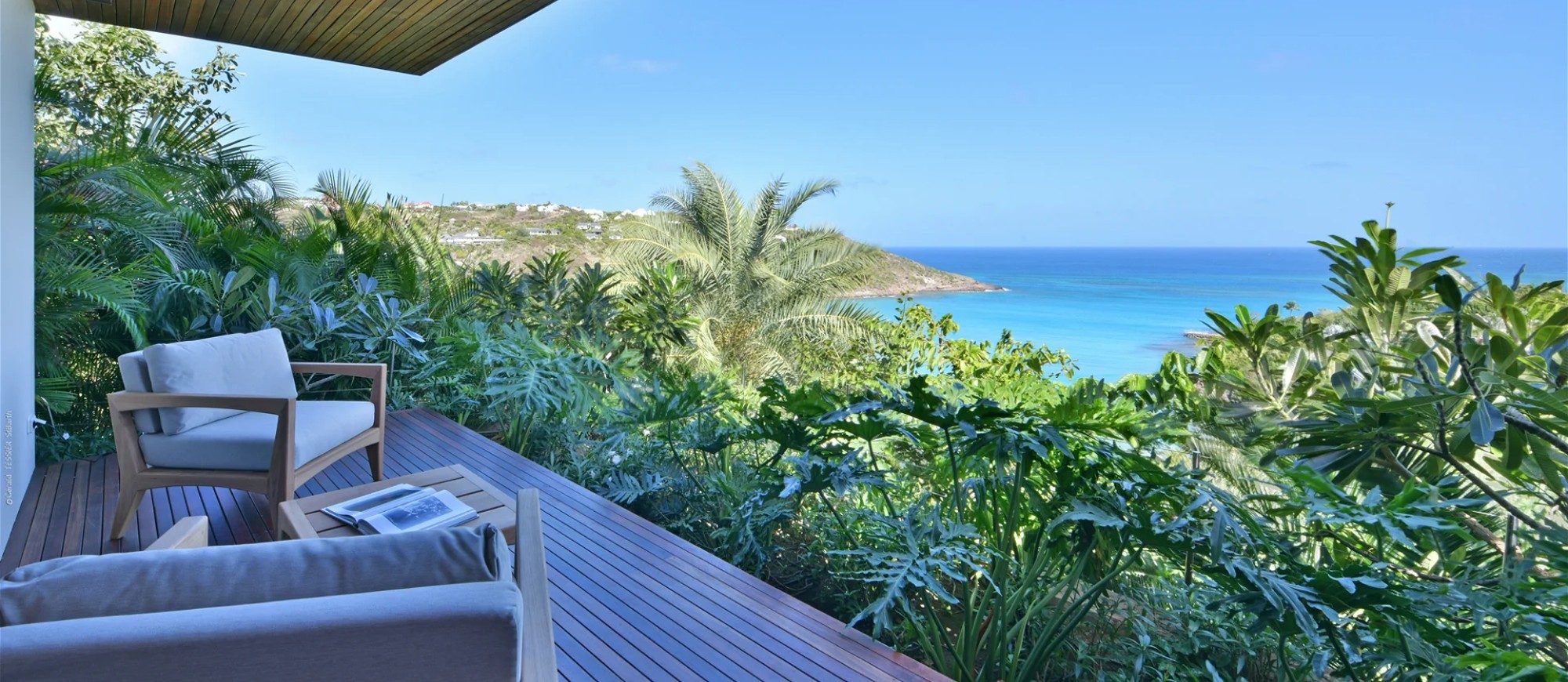 This is a new four-bedroom property located on the hill of Marigot. It is only a few minutes away from the lagoon of Grand-Cul-de-Sac and its famous kitesurfing spot, as well as beach restaurants. The property has several pavilions with a lovely view over the bay below; it is decorated in a contemporary style.
