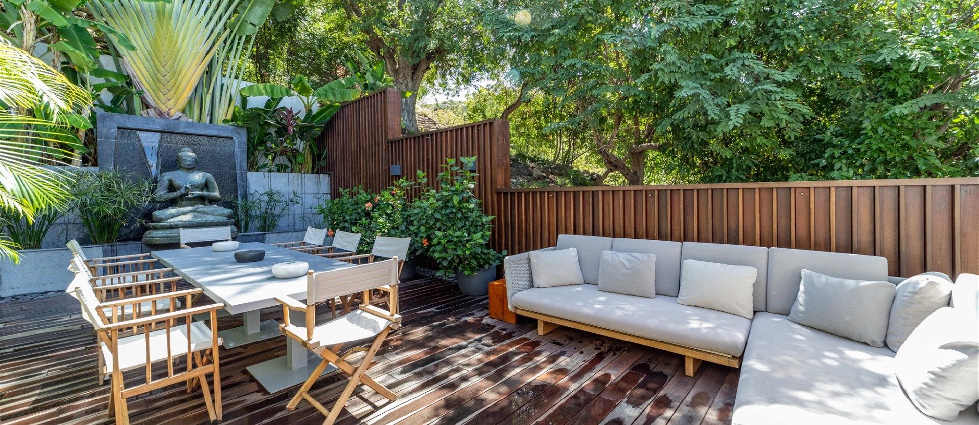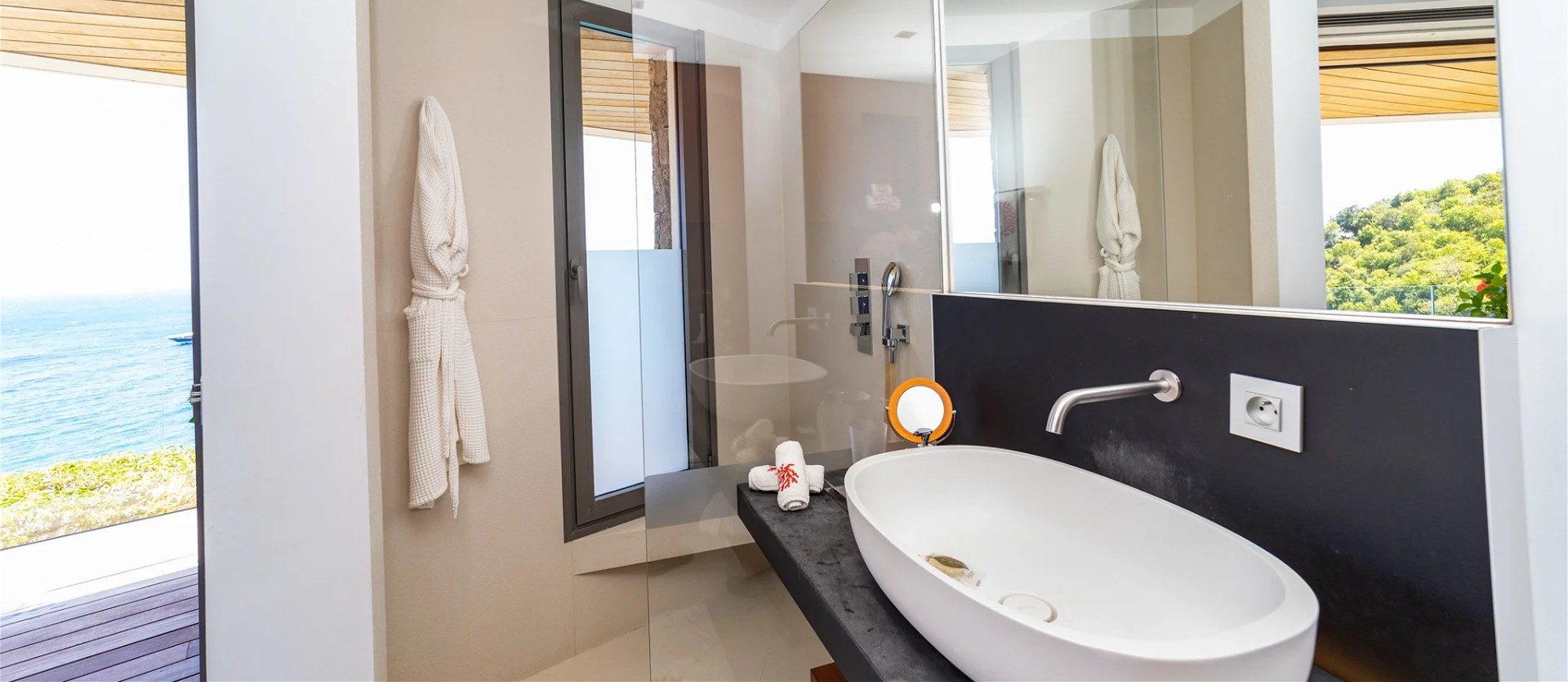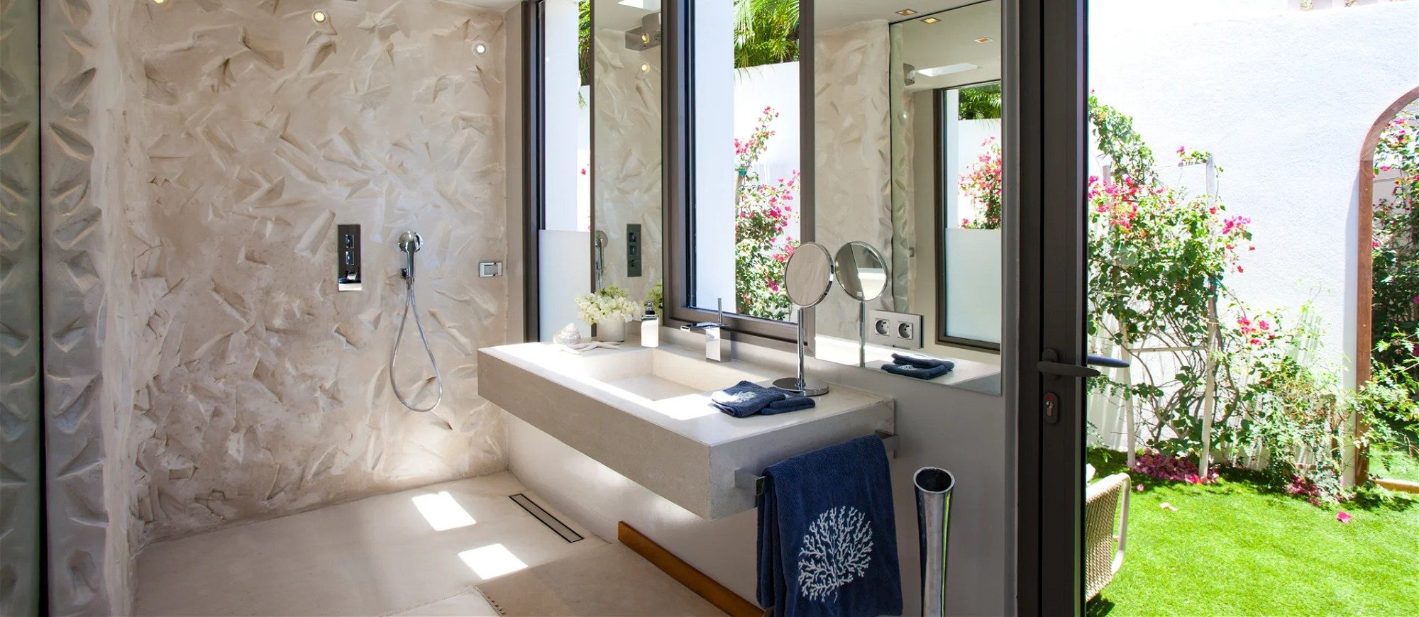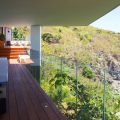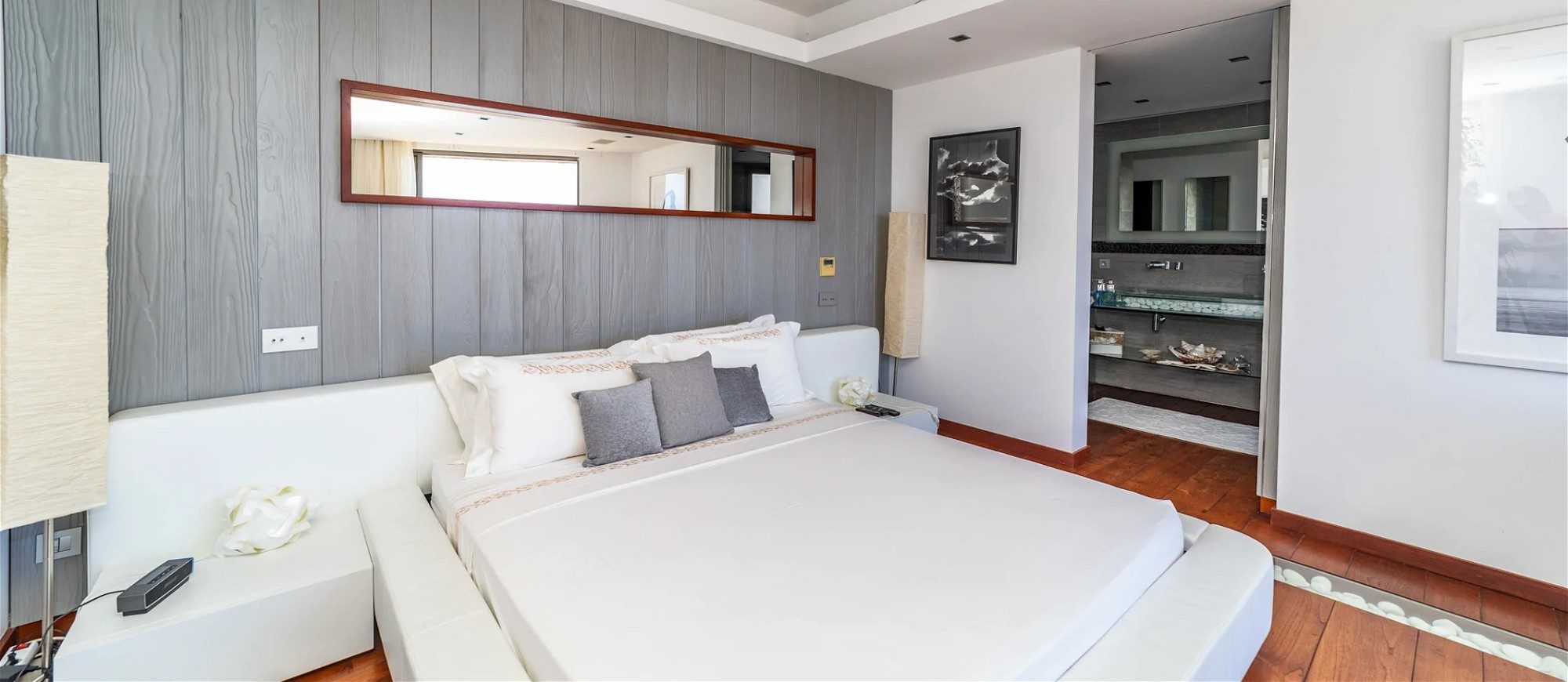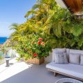 There are five beautiful air-conditioned bedrooms furnished with king or queen size beds, with en-suite bathrooms. Three of the bedrooms are on the lower level and offer stunning ocean views, while the other two ones are on the main level and open onto the pool deck. In a soothing white and grey decor, guests enjoy quiet and tranquillity. What’s more, at the back of the villa, a lovely zen garden welcomes you for morning coffee, meditation time or yoga sessions.