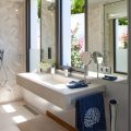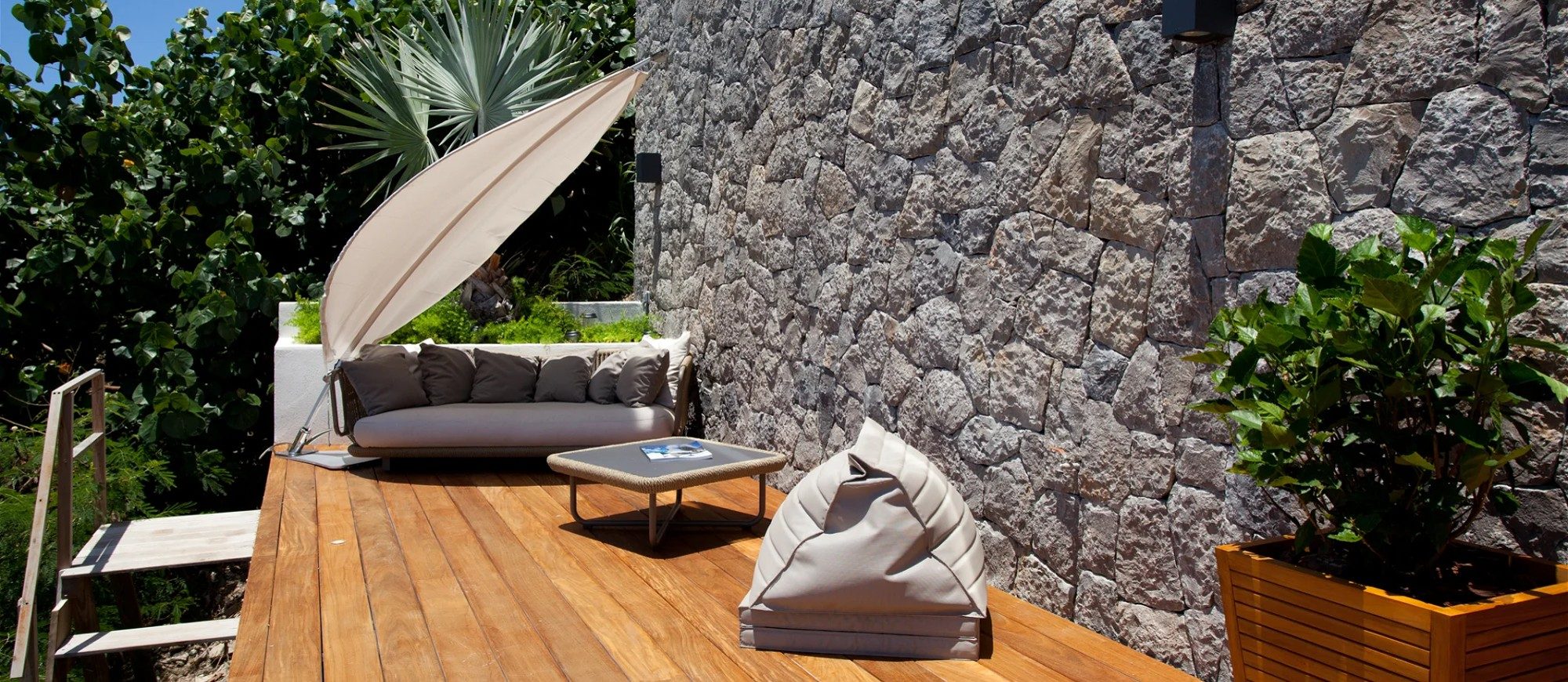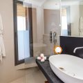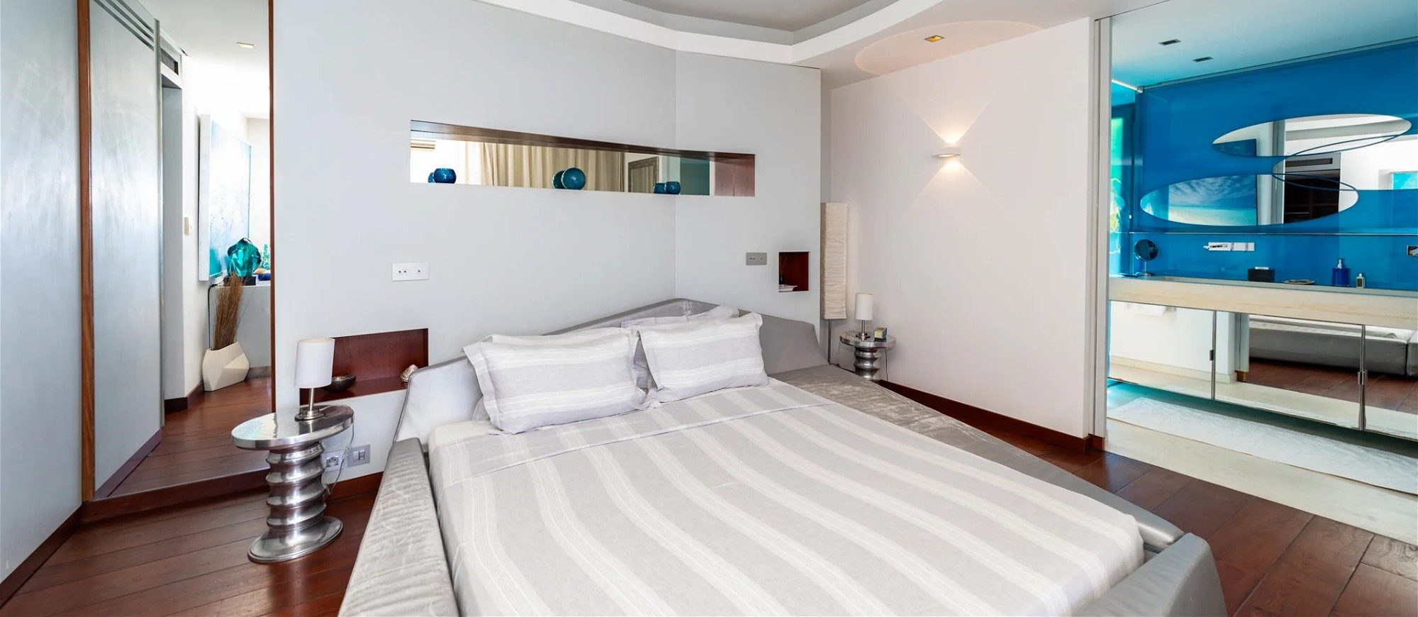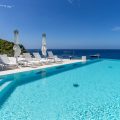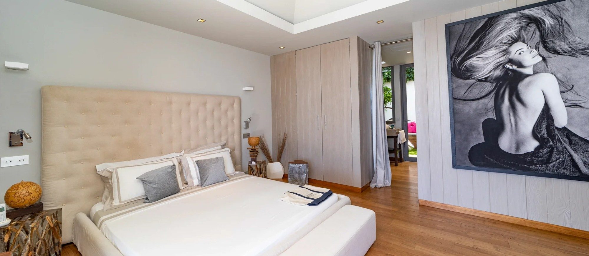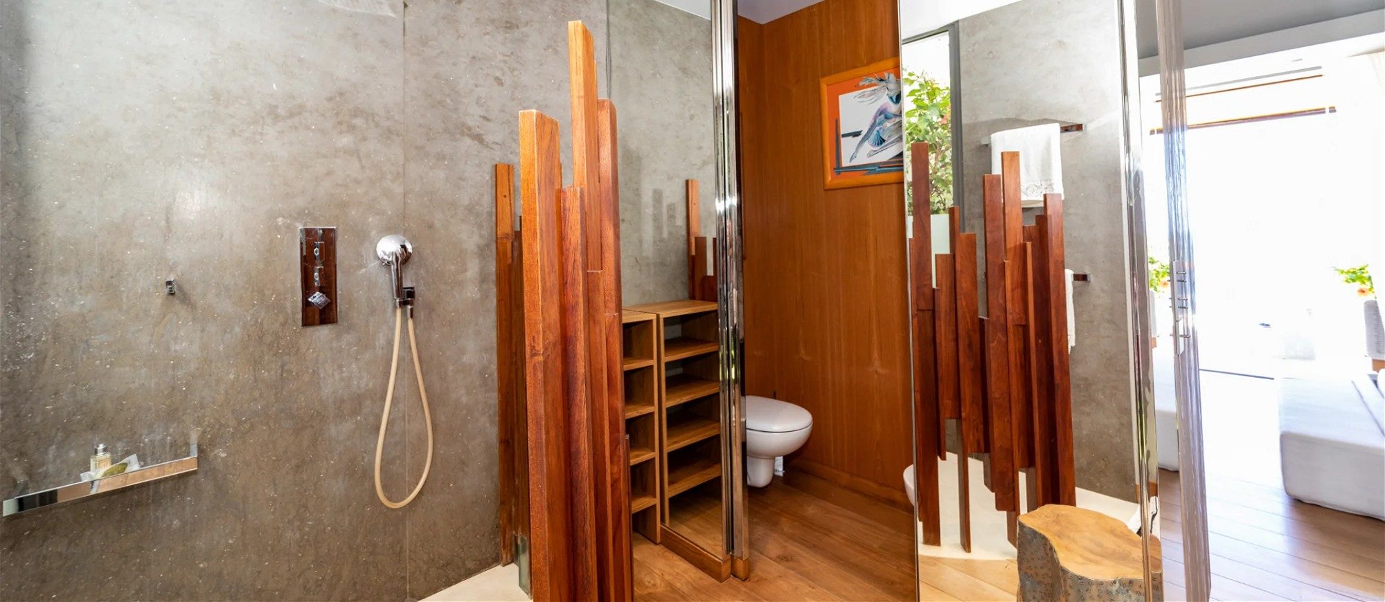 There are five beautiful air-conditioned bedrooms furnished with king or queen size beds, with en-suite bathrooms. Three of the bedrooms are on the lower level and offer stunning ocean views, while the other two ones are on the main level and open onto the pool deck. In a soothing white and grey decor, guests enjoy quiet and tranquillity. What’s more, at the back of the villa, a lovely zen garden welcomes you for morning coffee, meditation time or yoga sessions.