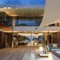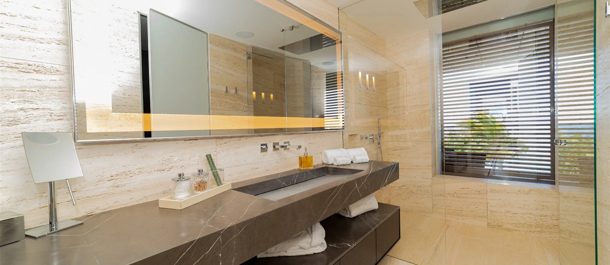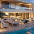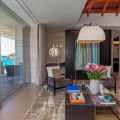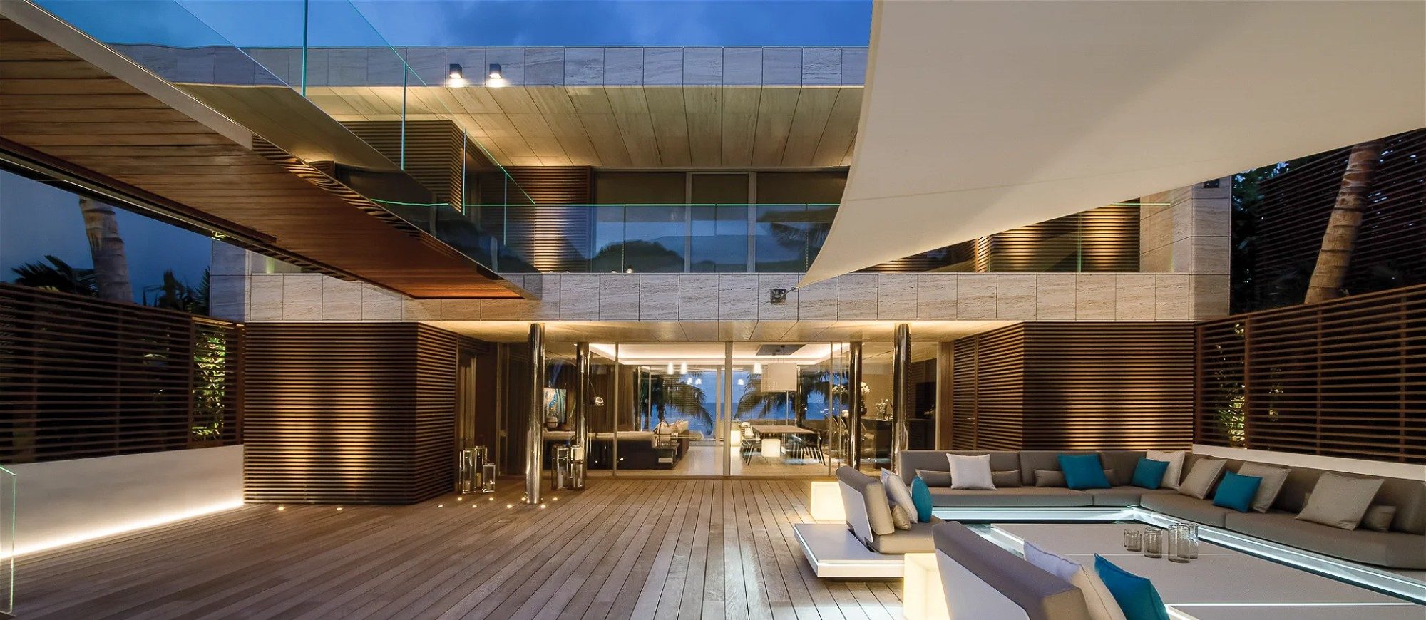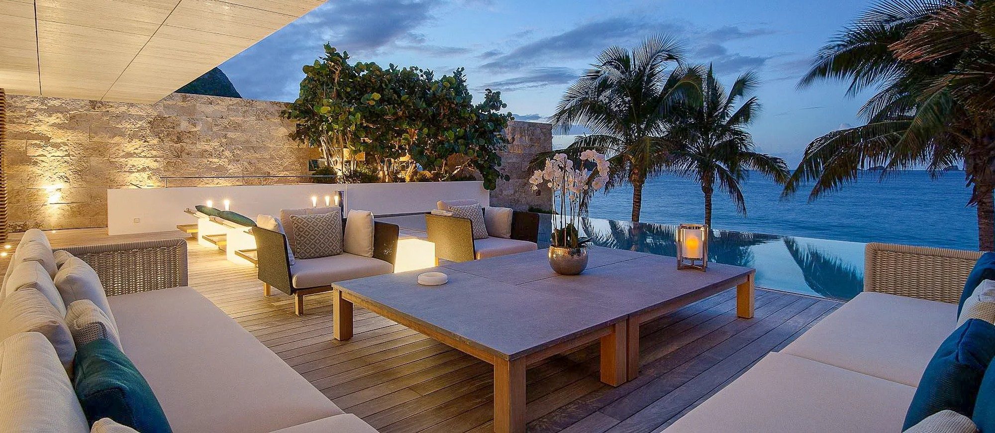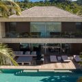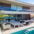 The property has two terraces and a patio, providing both sun and shade areas. On the first level, the terrace features an infinity swimming pool that seems to merge with the nearby ocean. The lower terrace is on the same level as the beach and has a jacuzzi and hanging chairs with outdoor showers. Sauna, steam room, gym and massage rooms are also available.