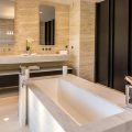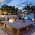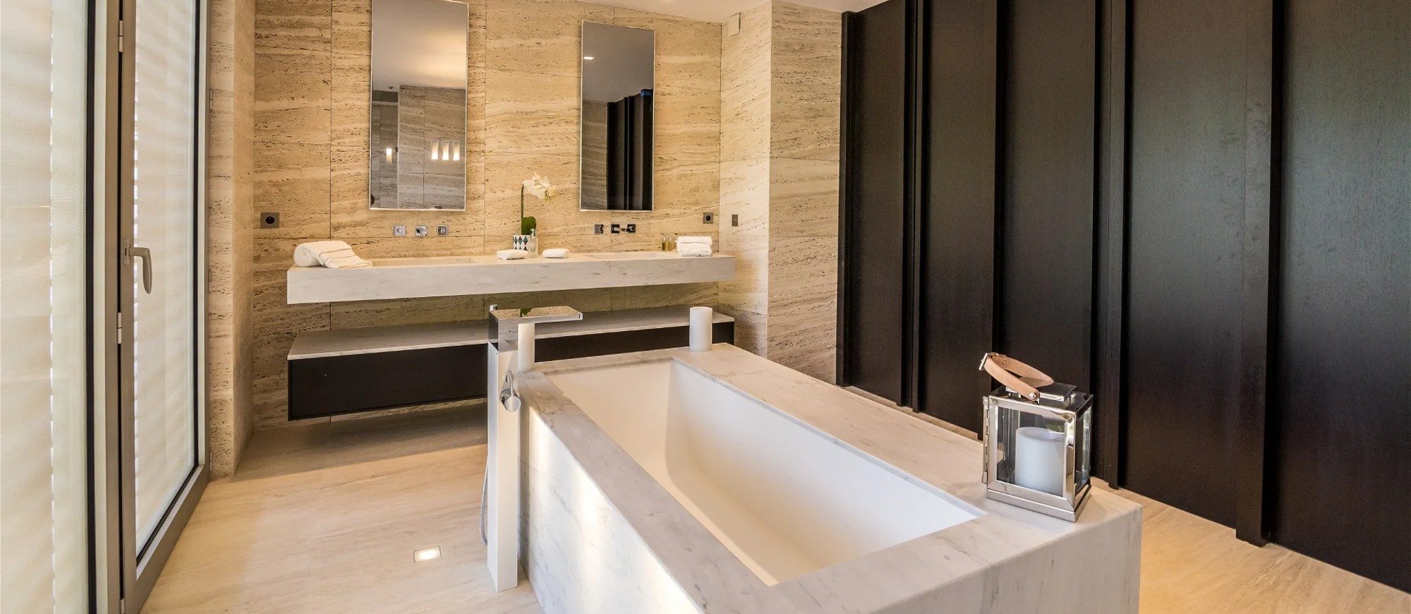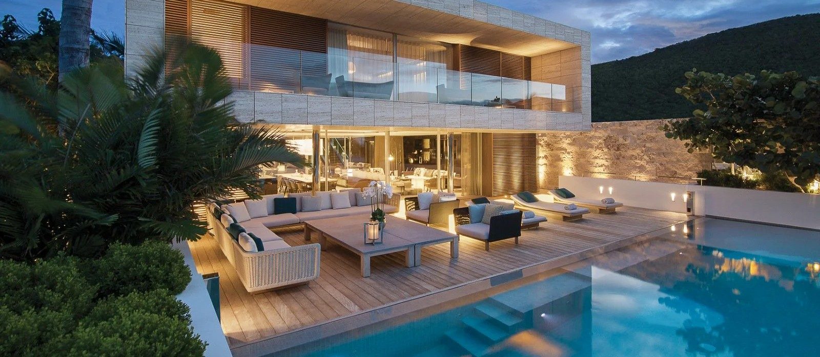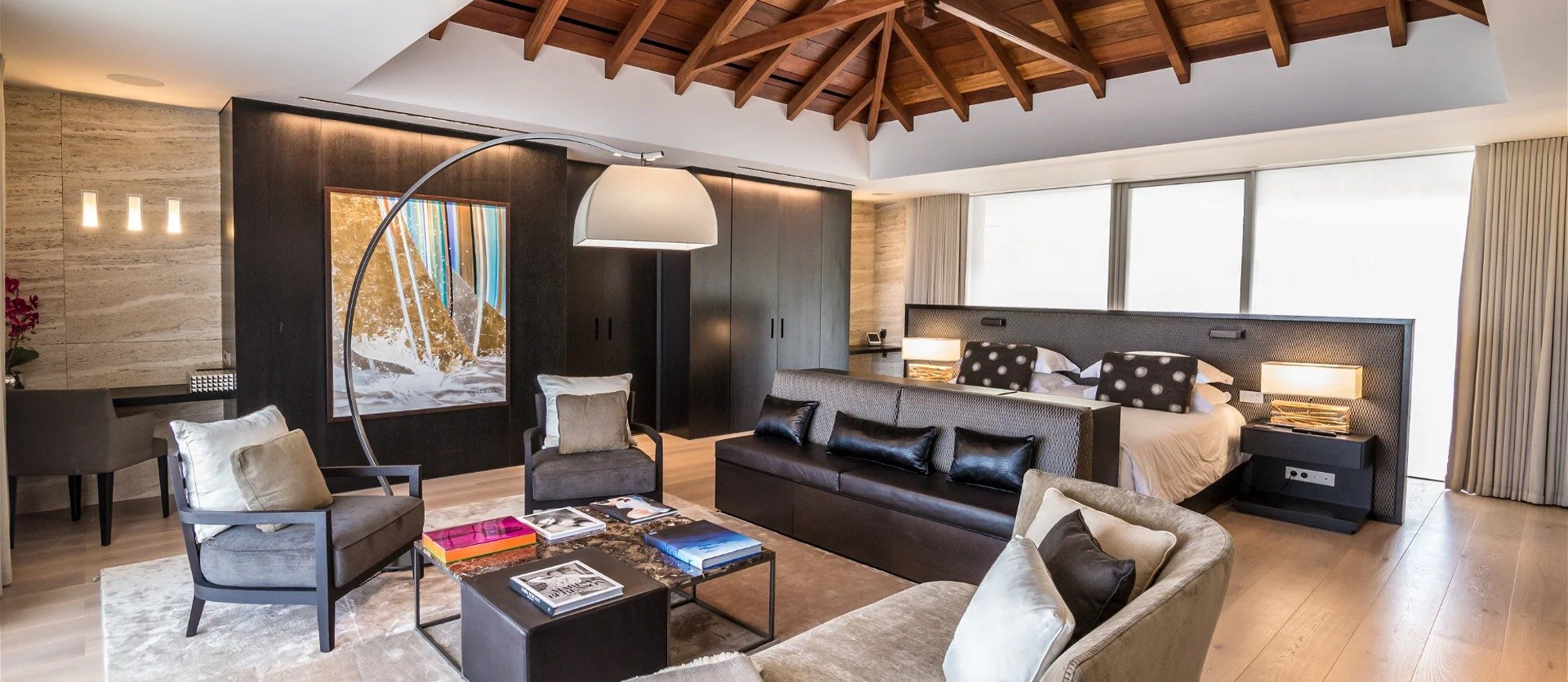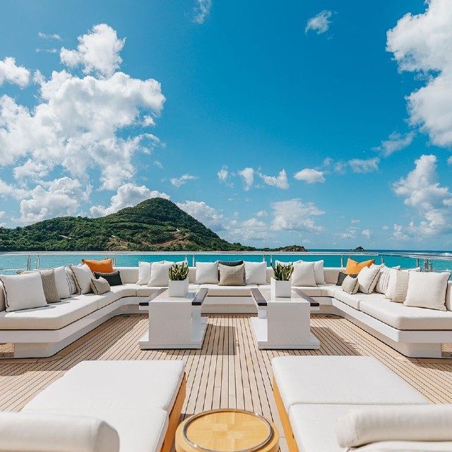 The property has two terraces and a patio, providing both sun and shade areas. On the first level, the terrace features an infinity swimming pool that seems to merge with the nearby ocean. The lower terrace is on the same level as the beach and has a jacuzzi and hanging chairs with outdoor showers. Sauna, steam room, gym and massage rooms are also available.