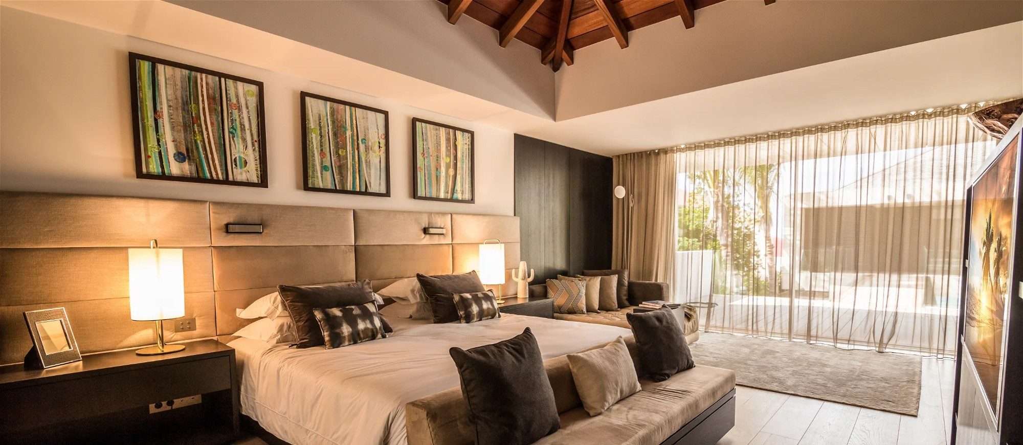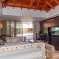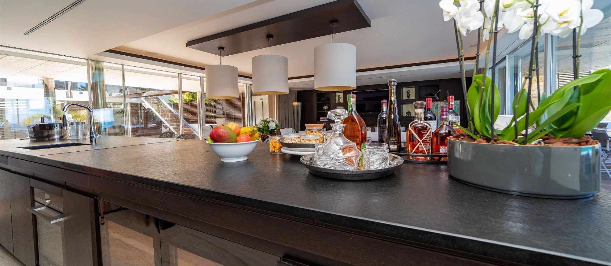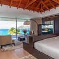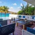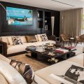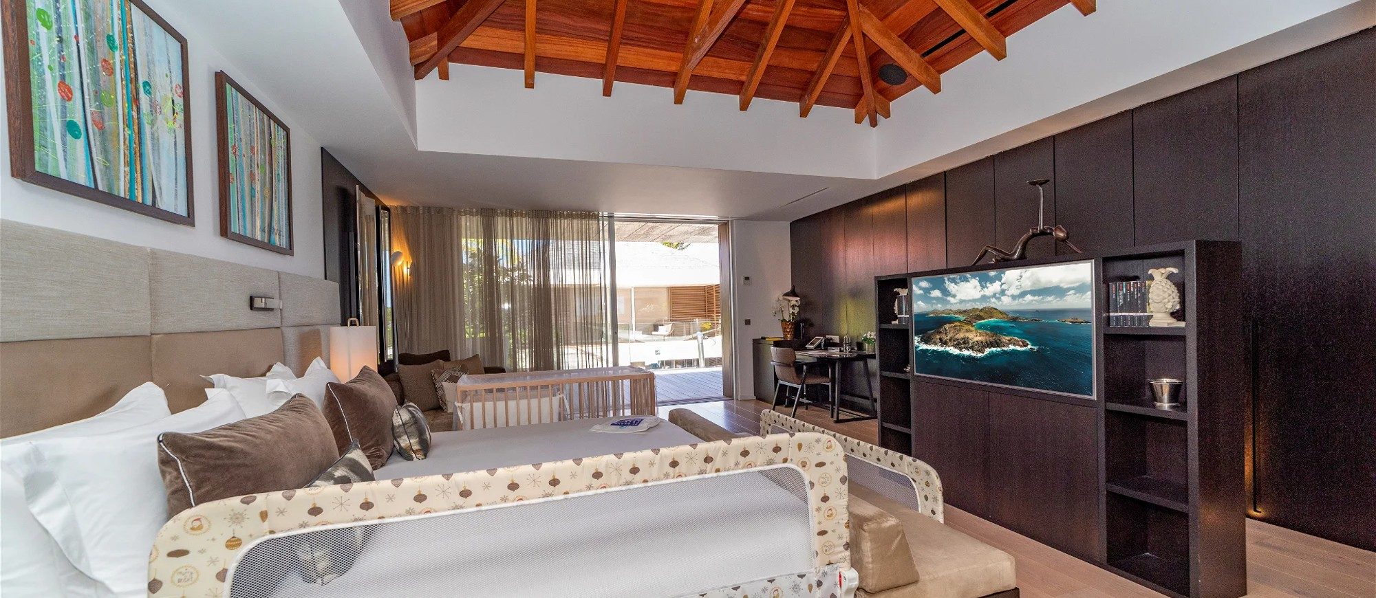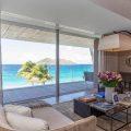 The villa was built in a contemporary design over three levels accessible by elevator, on the sand looking to Chevreau and Fregate islands. The main level is composed of a living room with sofas, tables and armchairs with sleek lines. The dining room can accommodate up to twelve people and faces the bay overlooking the ocean. The fully-equipped kitchen features a bar with dark hints which contrast with the wood and striking white that can be found throughout the villa. The cinema room is on the lower level.
