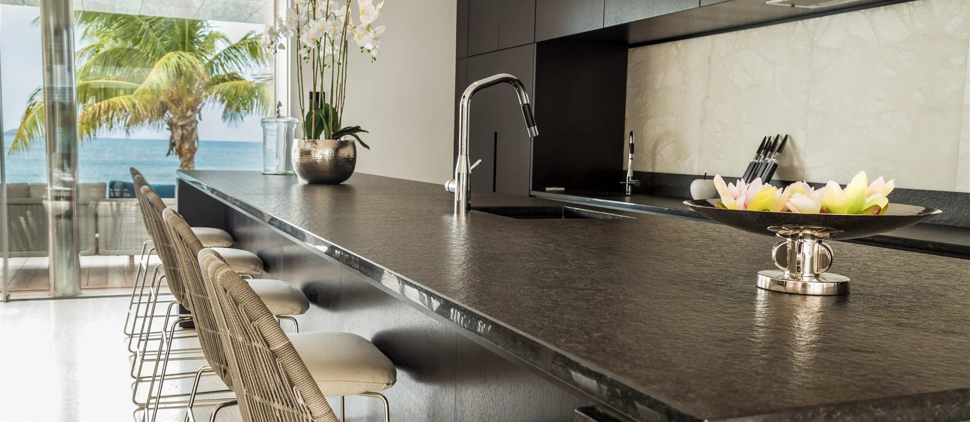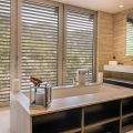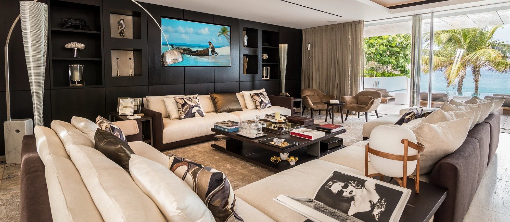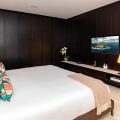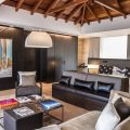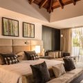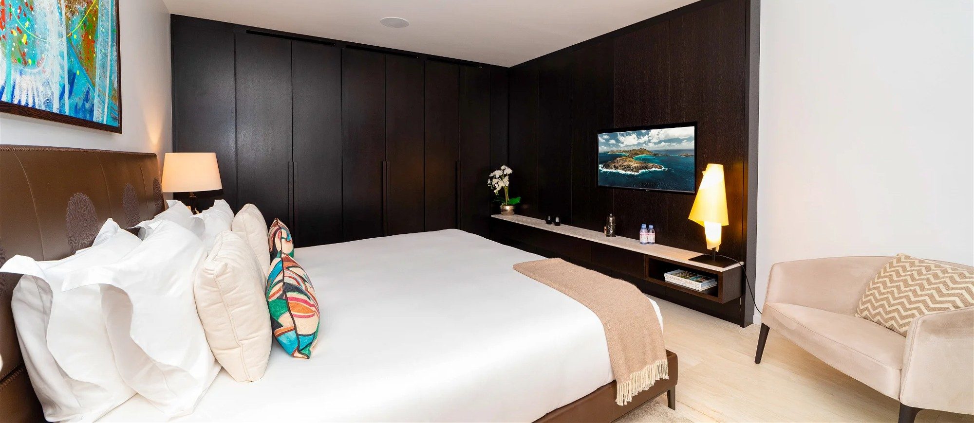 The villa was built in a contemporary design over three levels accessible by elevator, on the sand looking to Chevreau and Fregate islands. The main level is composed of a living room with sofas, tables and armchairs with sleek lines. The dining room can accommodate up to twelve people and faces the bay overlooking the ocean. The fully-equipped kitchen features a bar with dark hints which contrast with the wood and striking white that can be found throughout the villa. The cinema room is on the lower level.