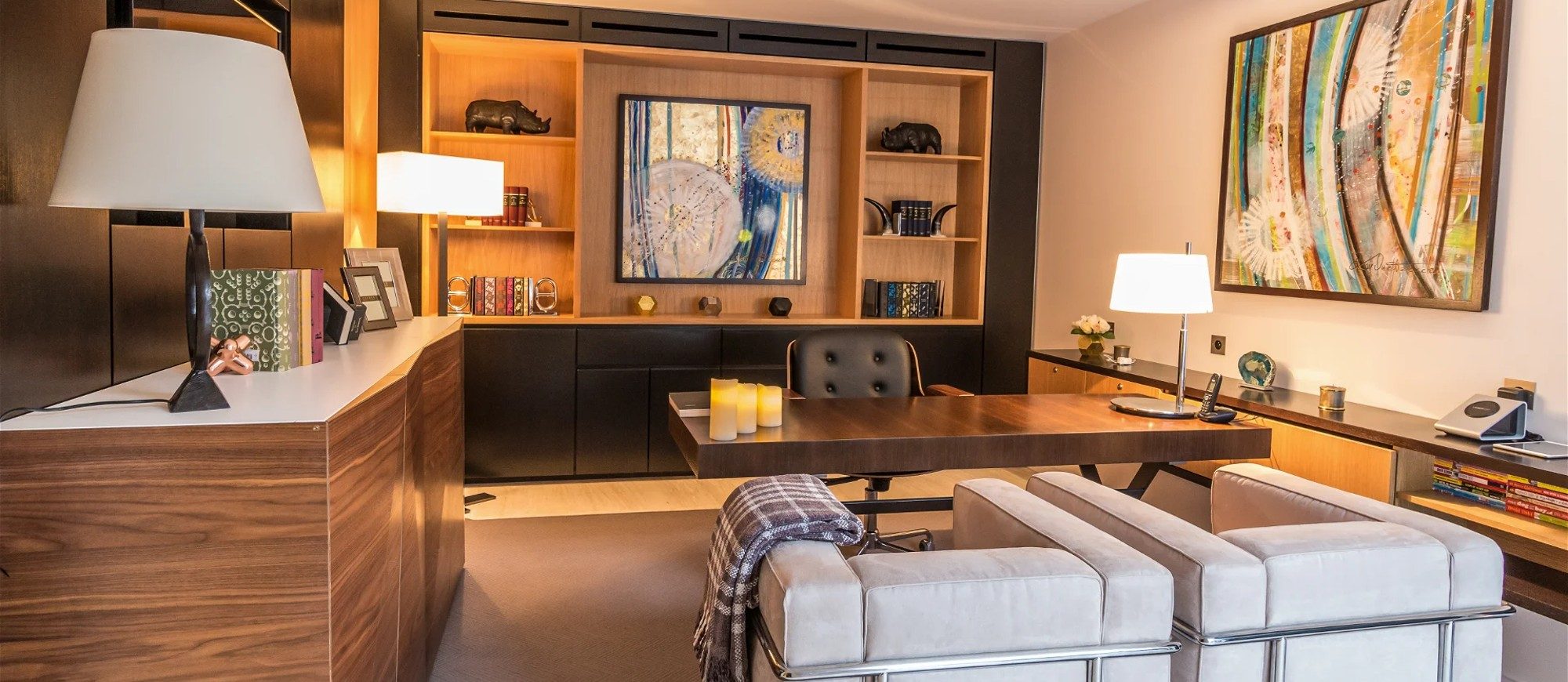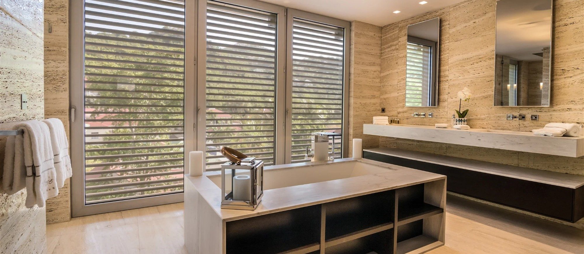 On the lower level, on the back of the property. Fully equipped and air conditioned office. Ensuite bathroom with indoor Italian shower, bathtub, hair dryer, towels and beach towels.
